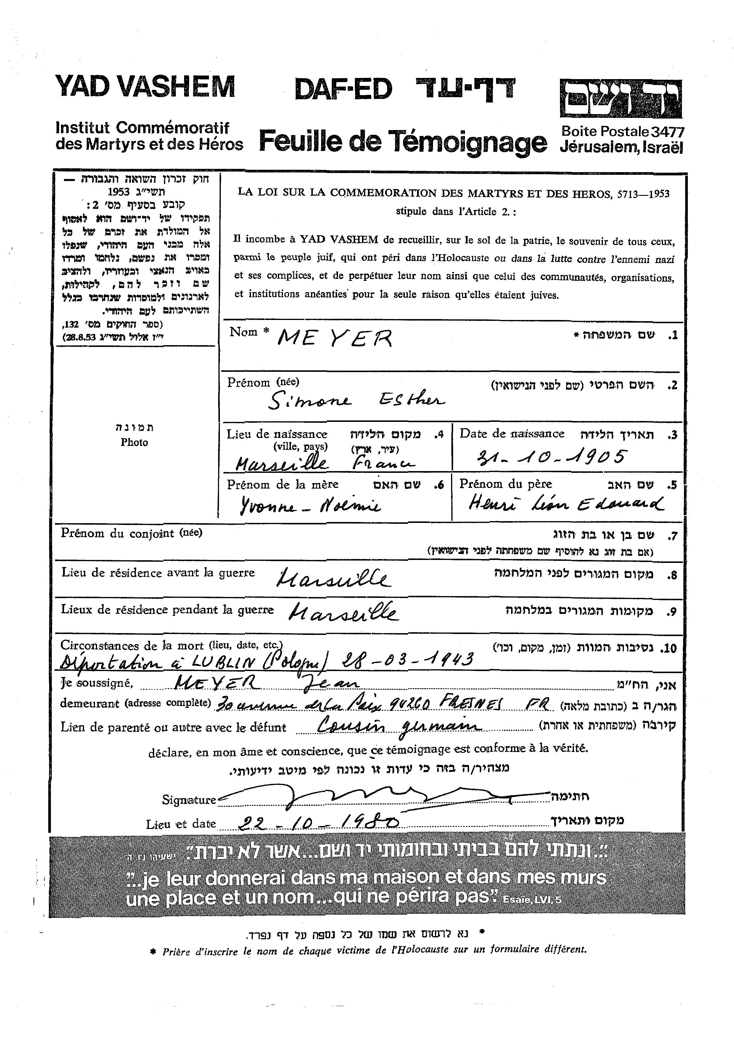 Meyer Simone 1905 Marseille, Frankreich Verfolgtenliste