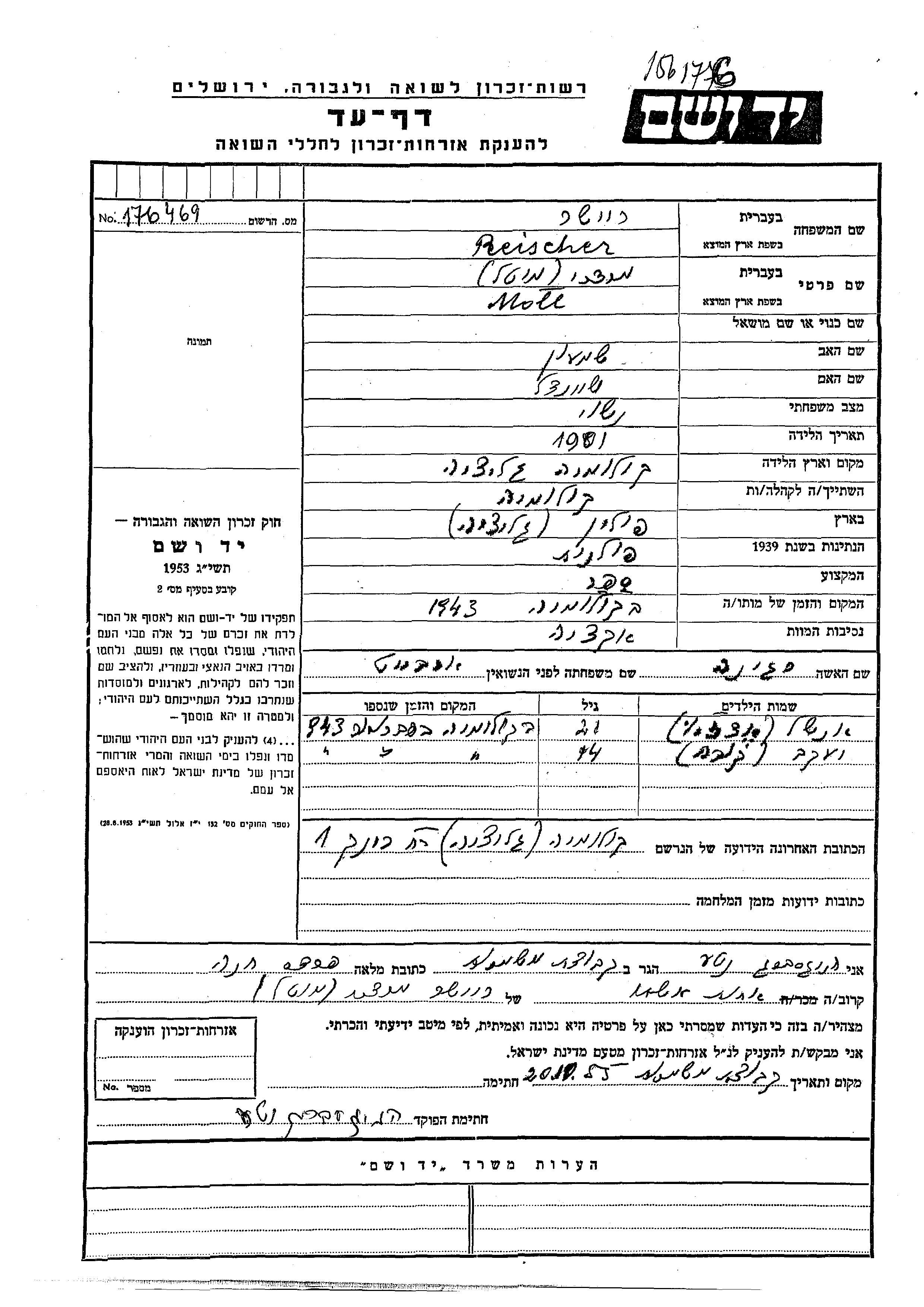 Mordekhai Reischer wurde im Jahr 1901 in Kolomyja, Polen geboren. Er war Friseur/-in. Vor dem Zweiten Weltkrieg lebte er in Kolomyja, Polen.