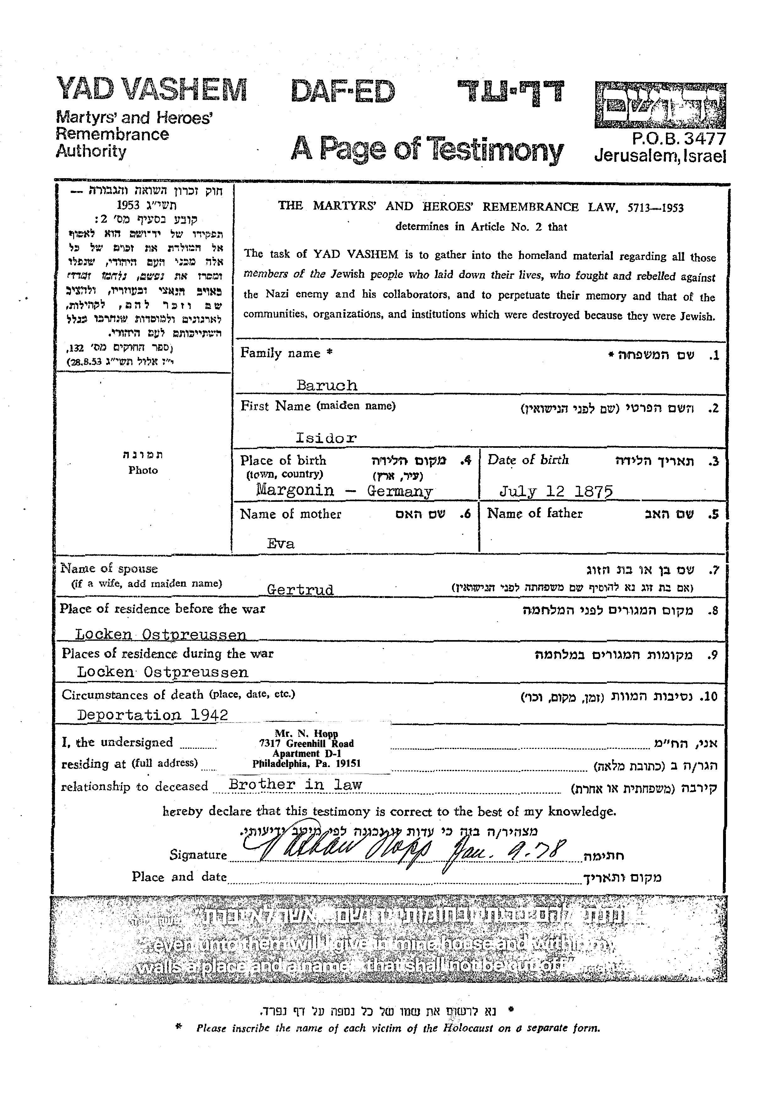 Baruch | Isidor | 1875 | Locken, Deutsches Reich | Gedenkblatt |