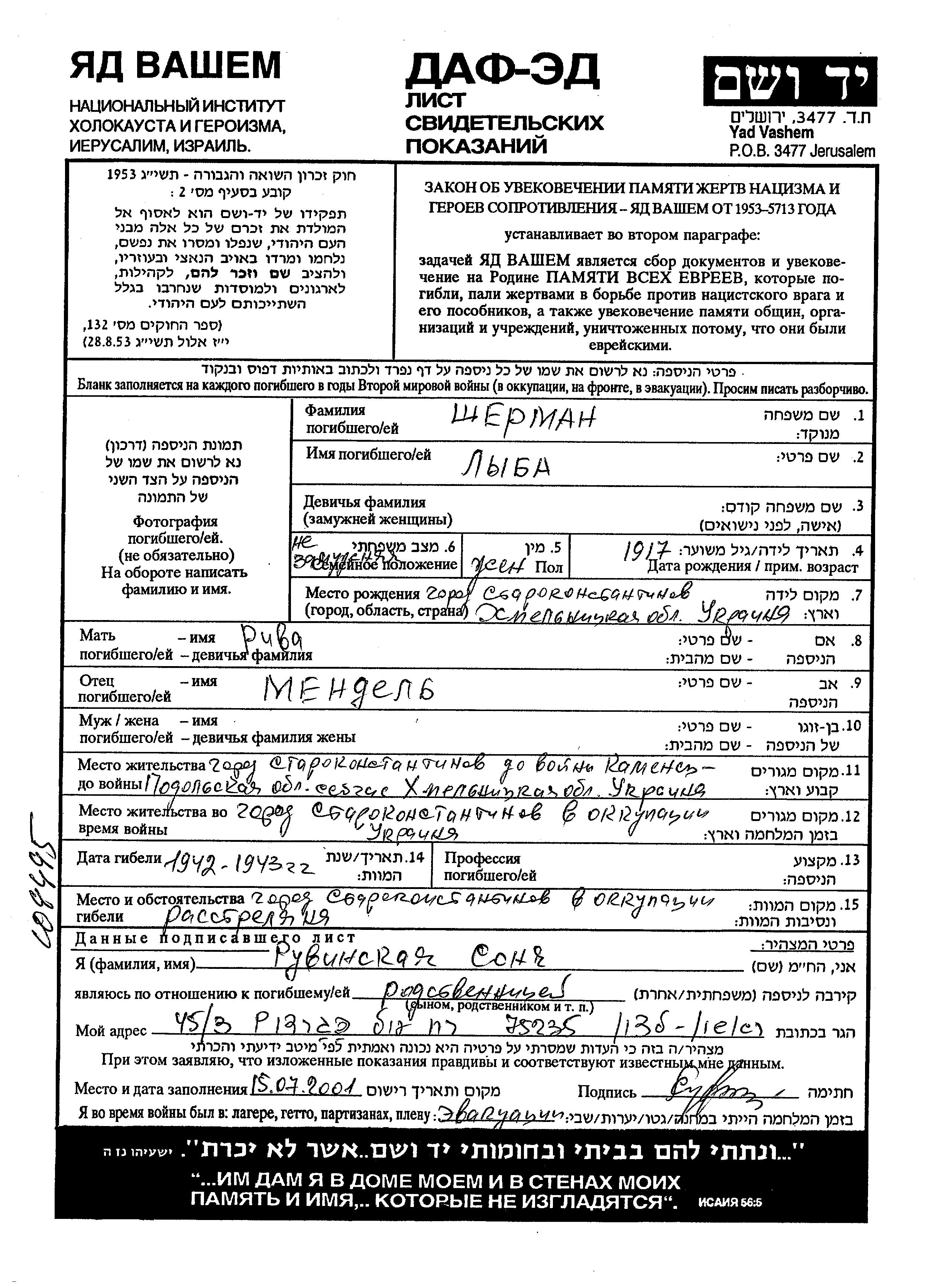 Lyba wurde in der Schoah ermordet. Todesort: Staro Konstantinov, Ukraine (UdSSR) im Jahr 1942.
