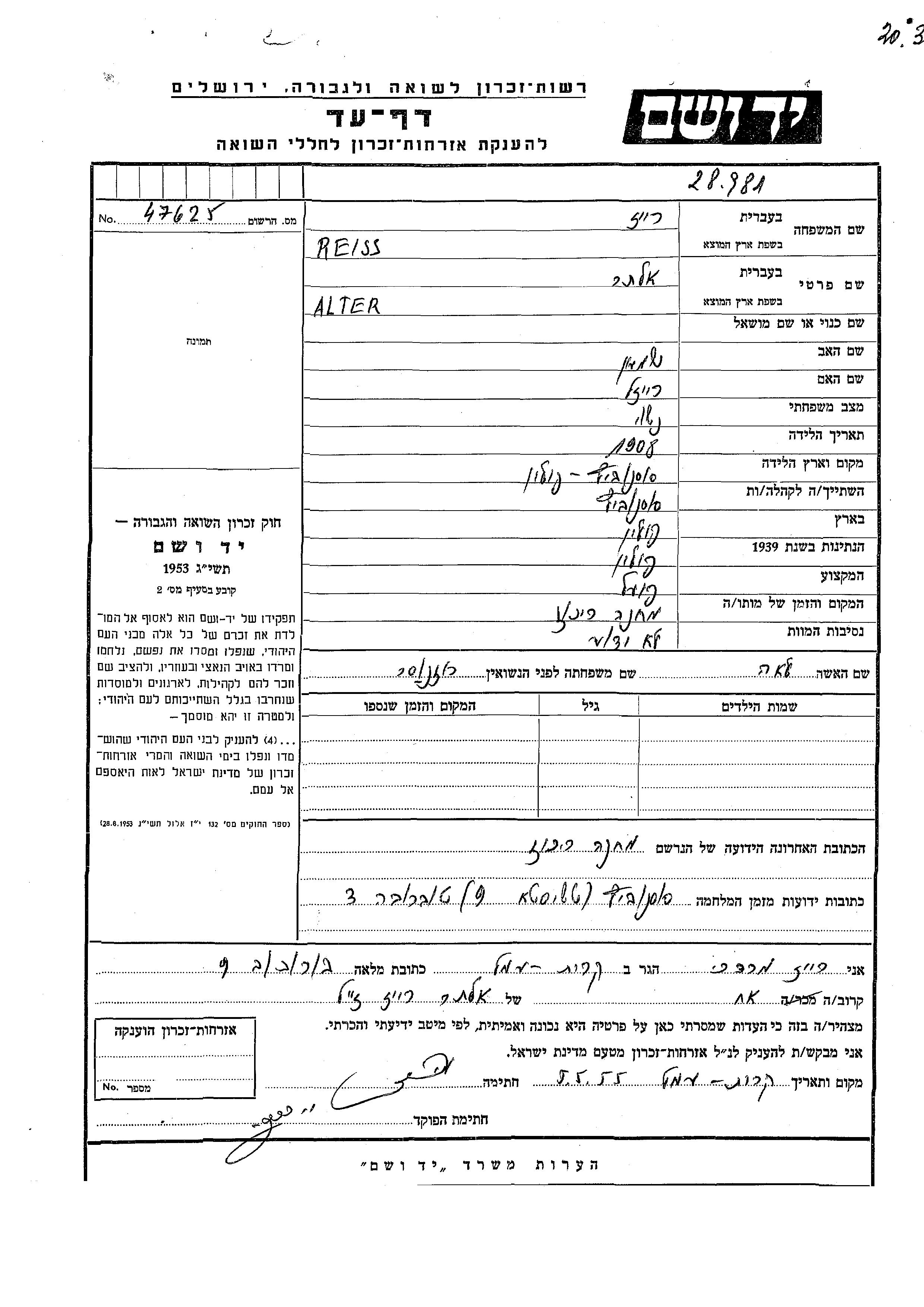 Alter Reiss wurde im Jahr 1908 in Sosnowic, Polen geboren. Vor dem Zweiten Weltkrieg lebte er in Sosnowiec, Polen.