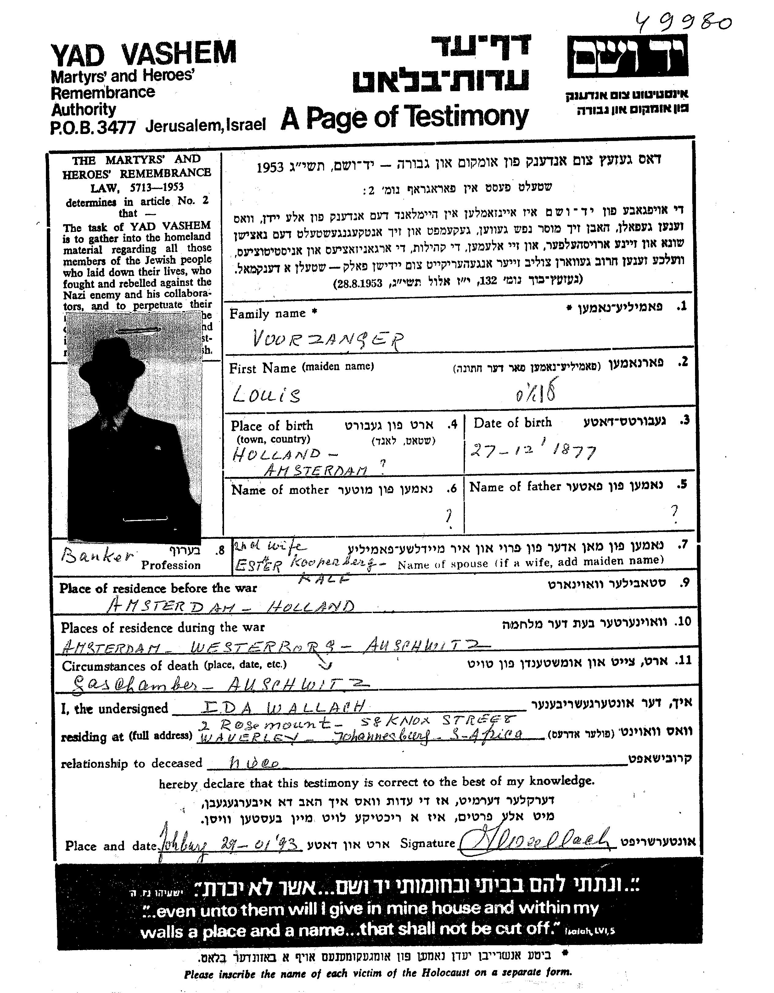 Voorzanger Louis 1877 Amsterdam, Niederlande Verfolgtenliste