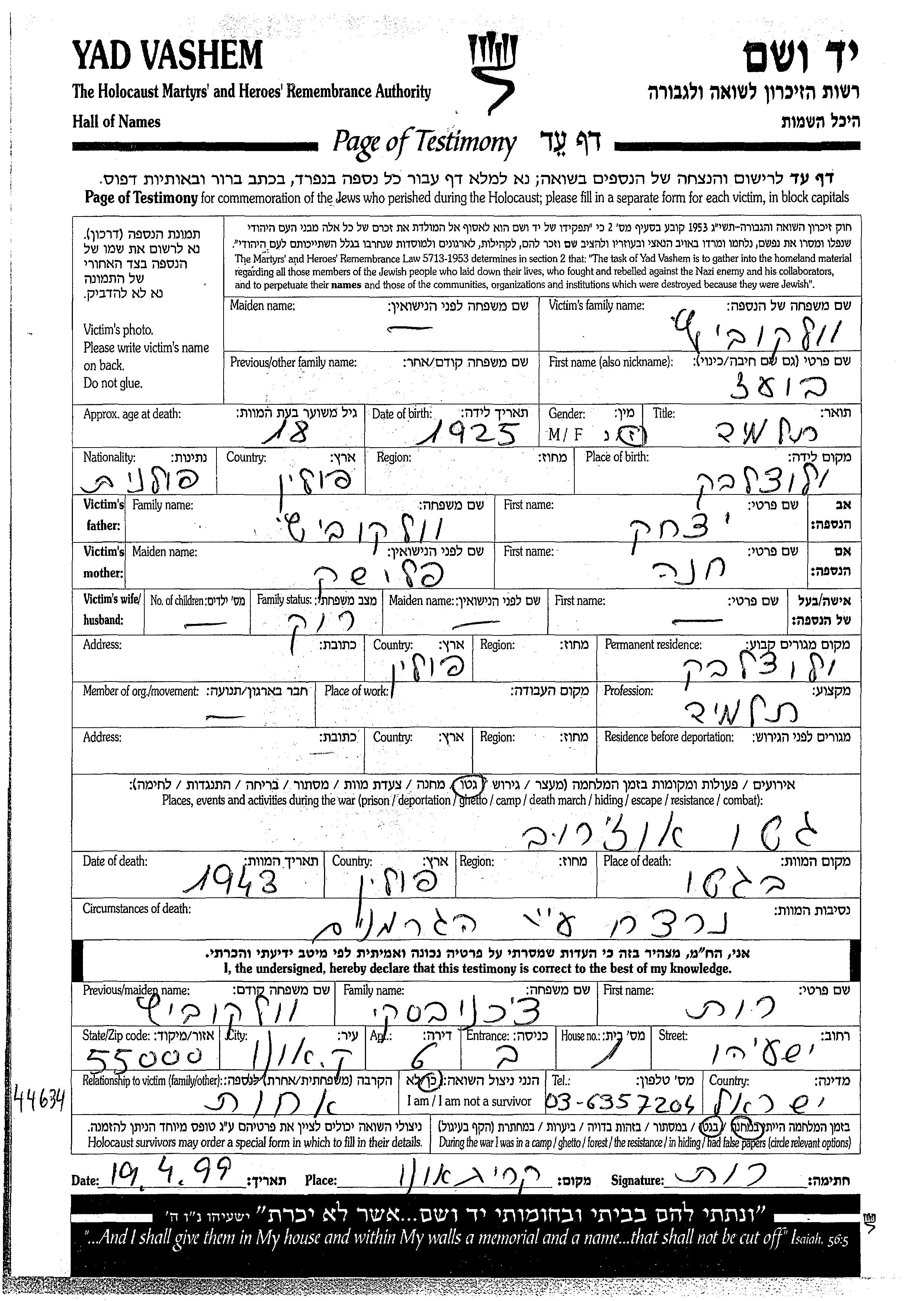 Boaz wurde in der Schoah ermordet. Todesort: unbekannt im Jahr 1943.