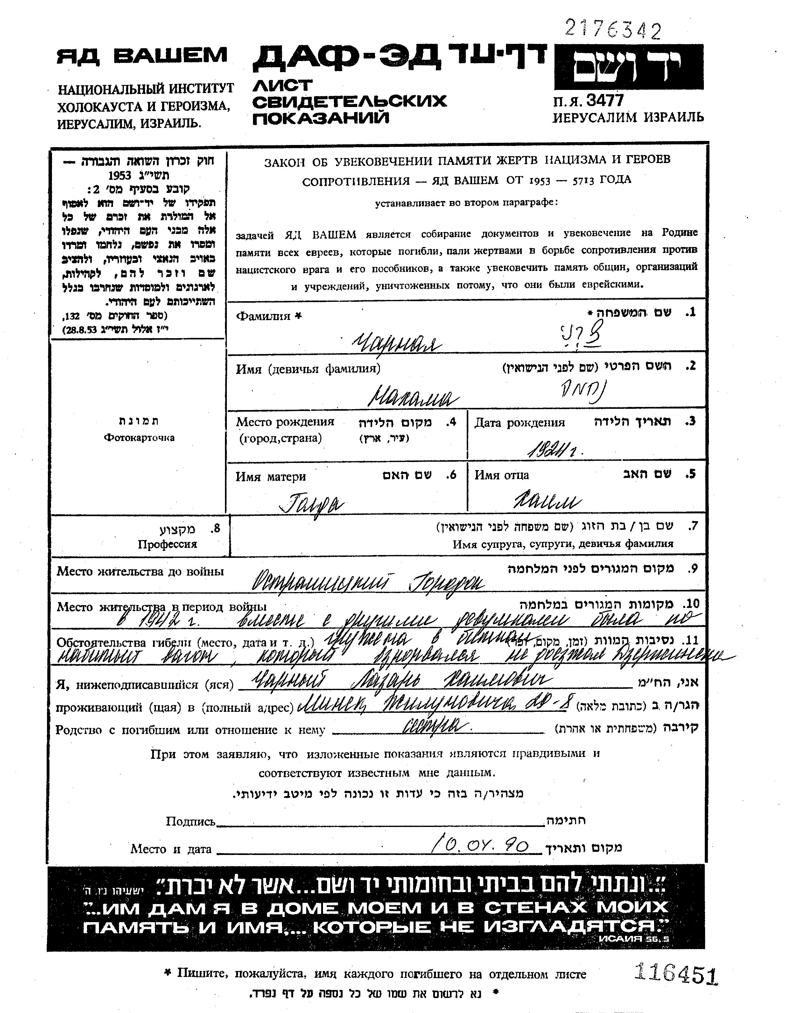 Nekhama wurde in der Schoah ermordet. Todesort: Minsk, Weißrussland (UdSSR) im Jahr 1942.