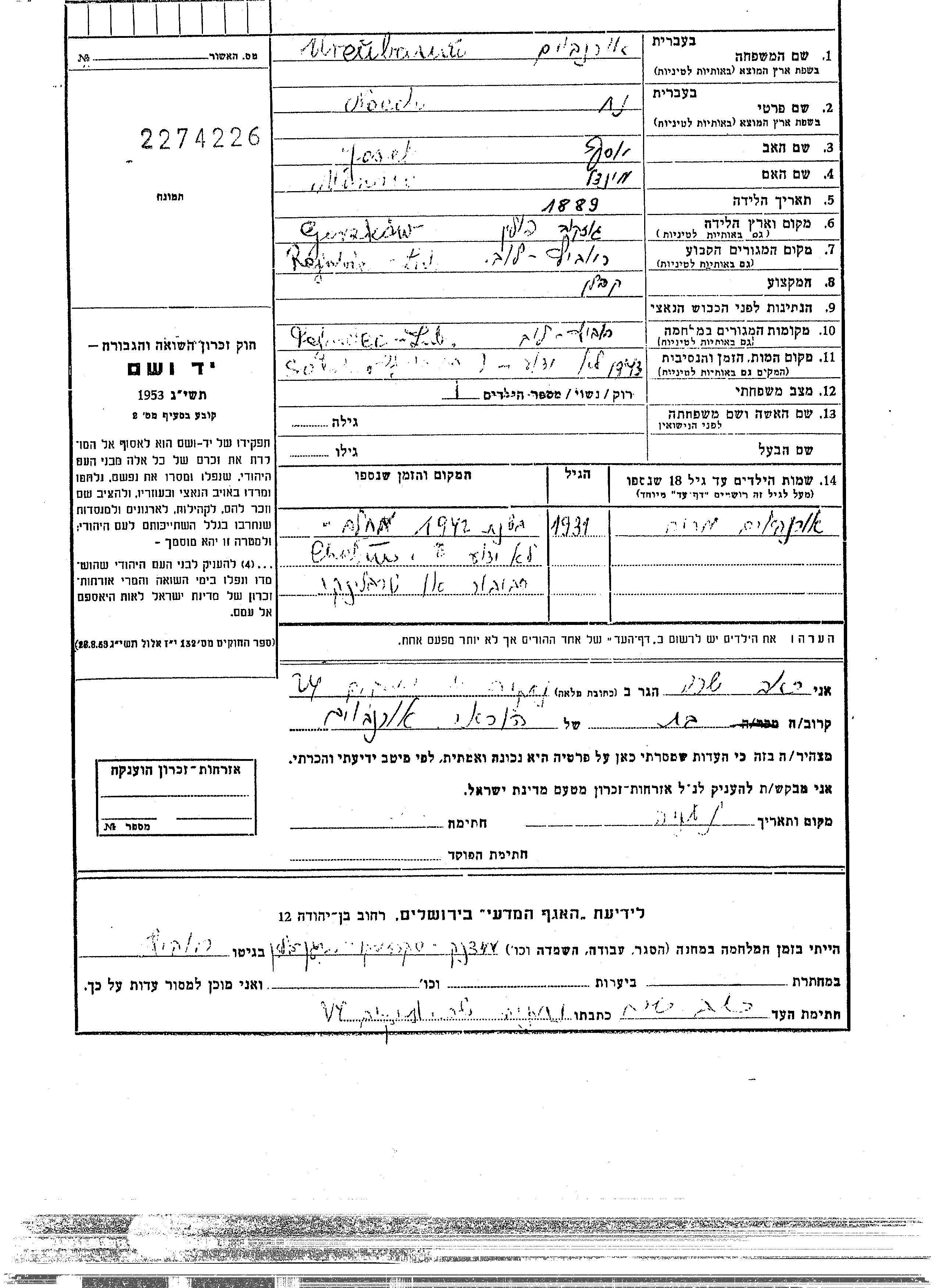 Orenboim | Miriam | 1931 | Rejowiec, Polen | Gedenkblatt |