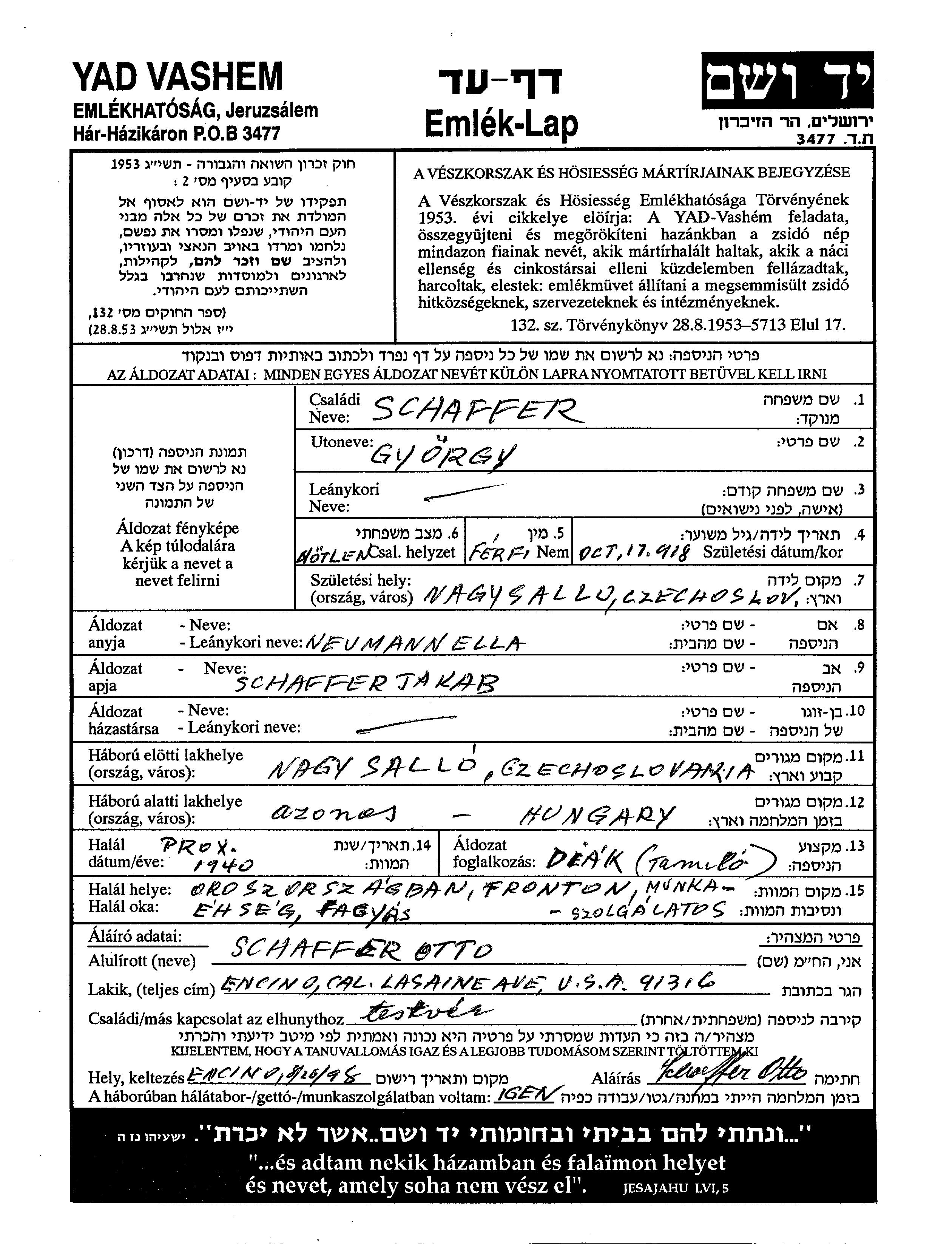 Gyorgy Schaffer wurde im Jahr 1918 geboren. Er war Schüler/-in. Vor dem Zweiten Weltkrieg lebte er in Nagy Sollo, Tschechoslowakei.
