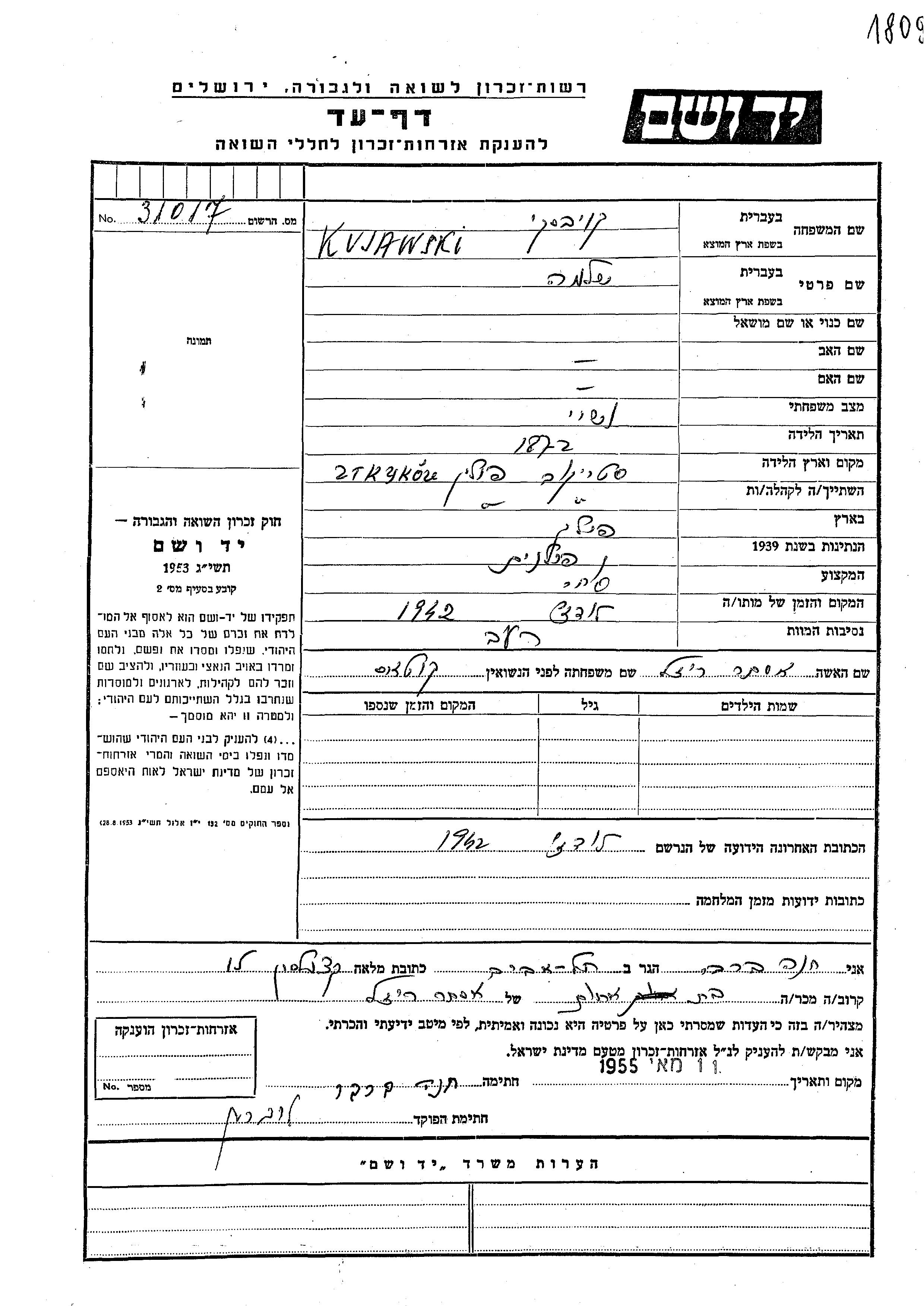 Shlomo Kujawski wurde im Jahr 1872 in Strykow, Polen geboren. Er war Kaufmann/-frau. Während des Krieges war er in Lodz, Polen.