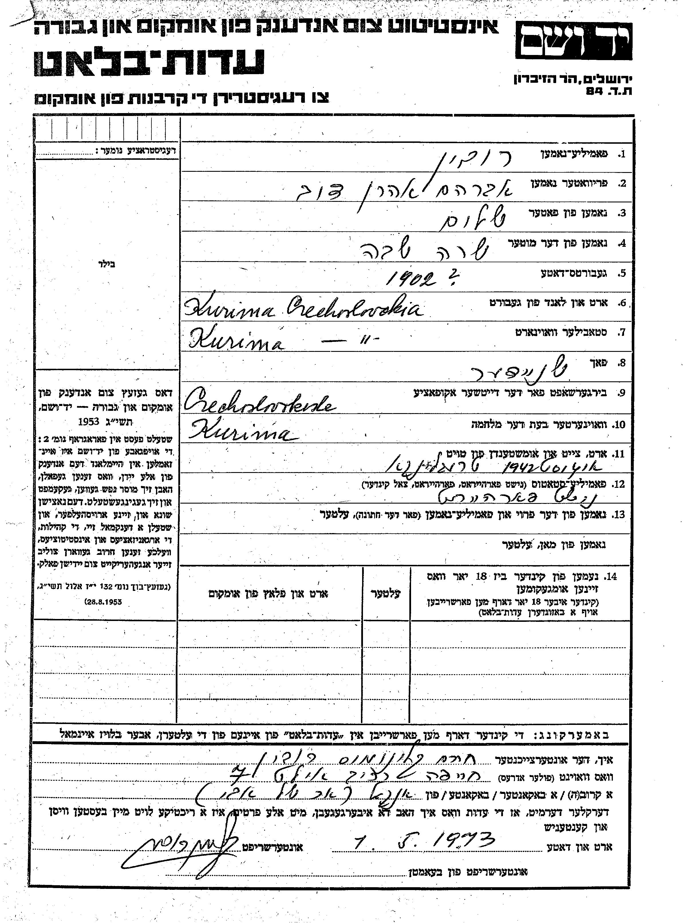 | Rubin | Avraham Aharon Dov | 1902 | Kurima, Tschechoslowakei | Gedenkblatt |