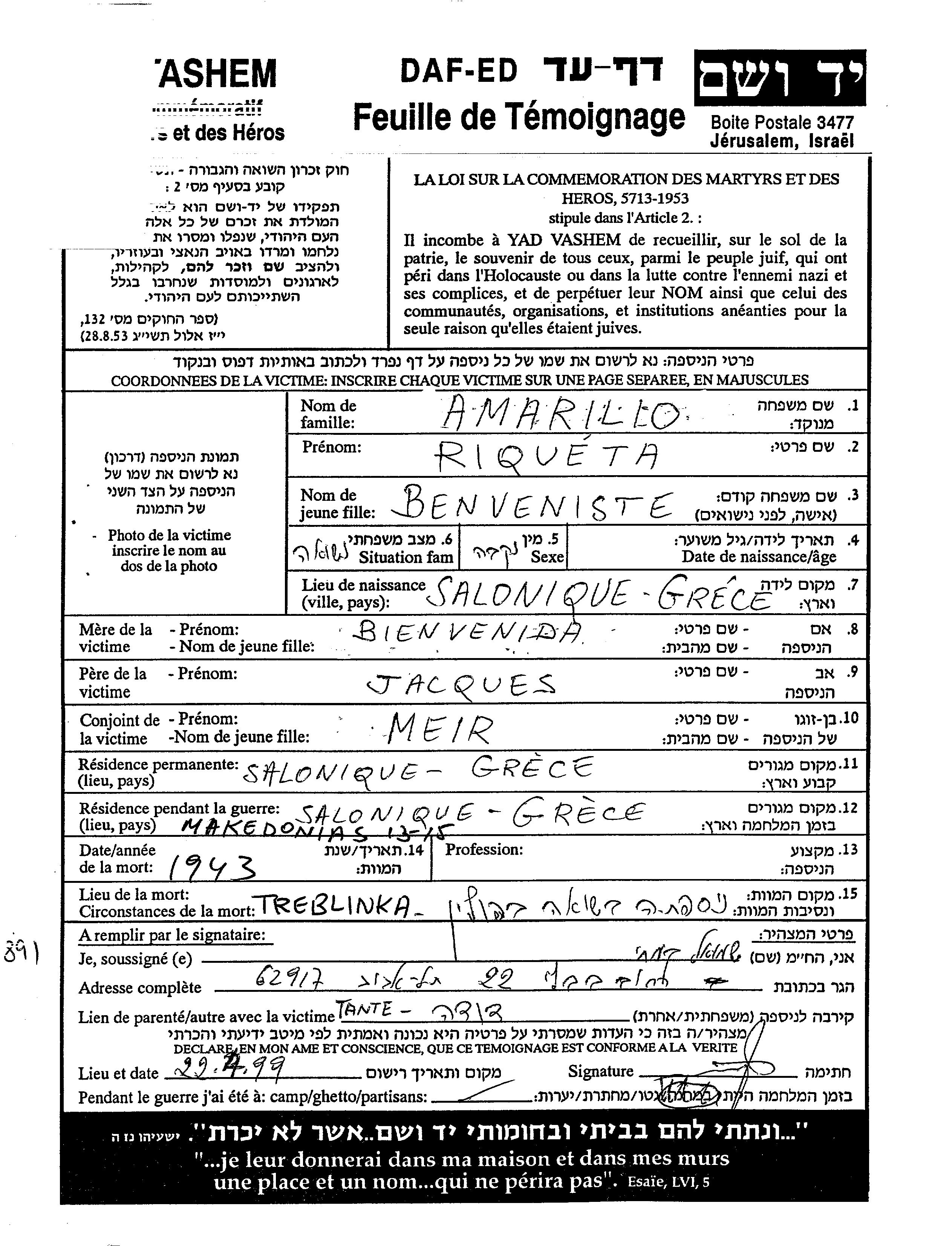 Riqueta Henrieta Amarilio, geb. Benveniste. Sie war Hausfrau. Vor dem Zweiten Weltkrieg lebte sie in Thessaloniki, Griechenland.