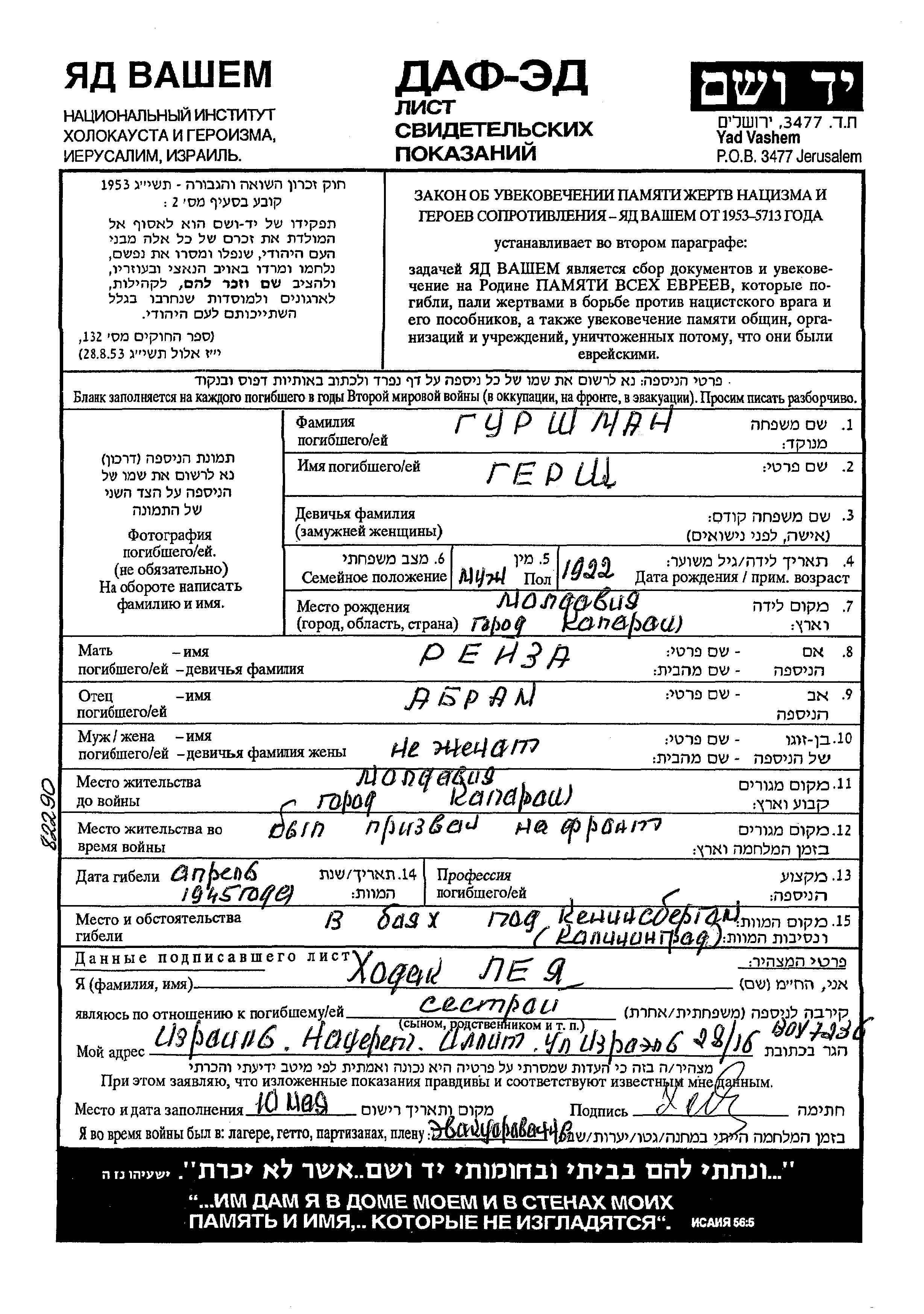 Gersh Gurshman wurde im Jahr 1922 in Kalarash, Rumänien geboren. Er war Angestellte/-r. Vor dem Zweiten Weltkrieg lebte er in Kalarash, Rumänien.
