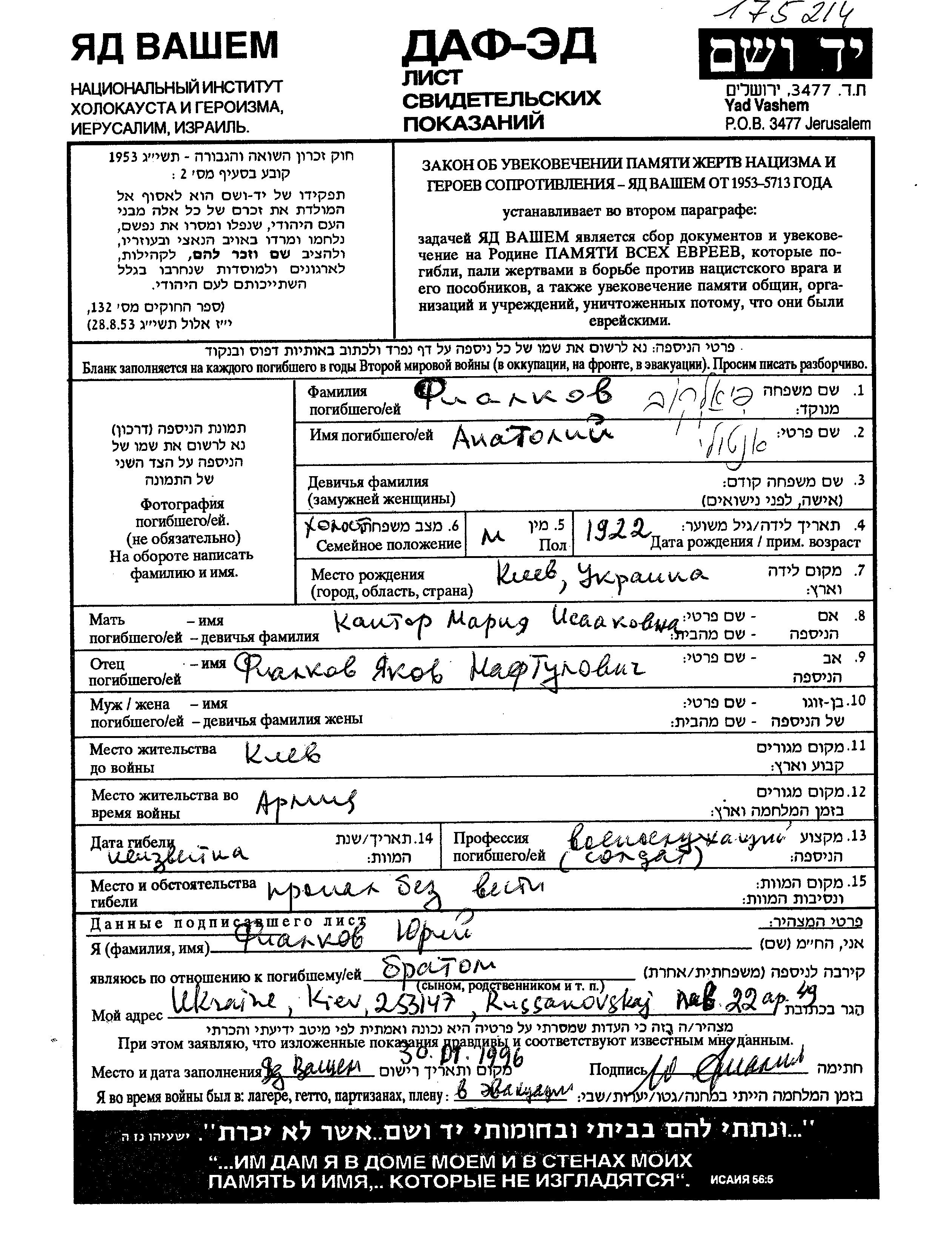Anatoli wurde in der Schoah ermordet. Todesort: unbekannter Ort im Jahr 1941.