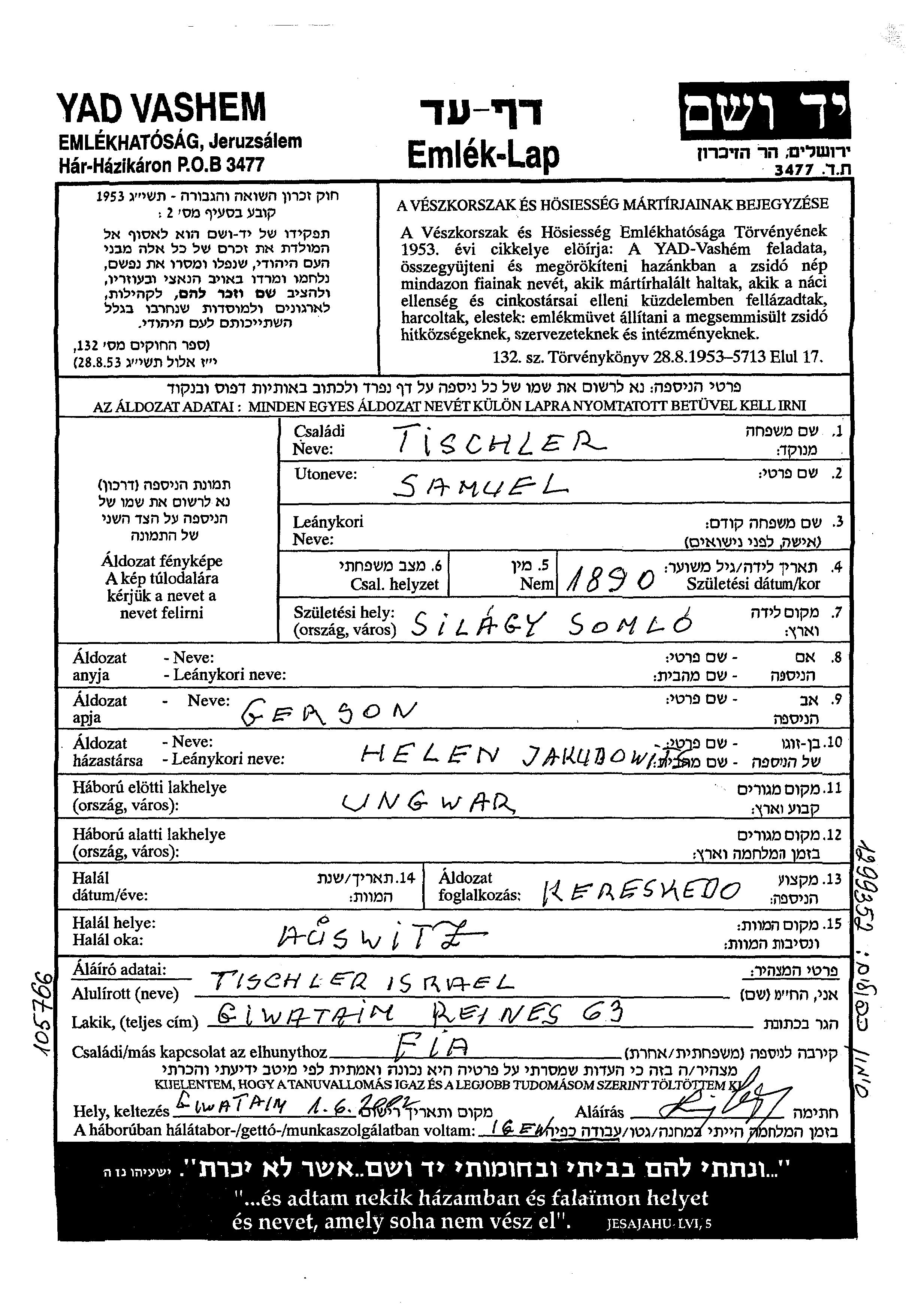 Samuel Tischler wurde im Jahr 1890 geboren. Er war Kaufmann/-frau. Vor dem Zweiten Weltkrieg lebte er in Ungvar, Tschechoslowakei.