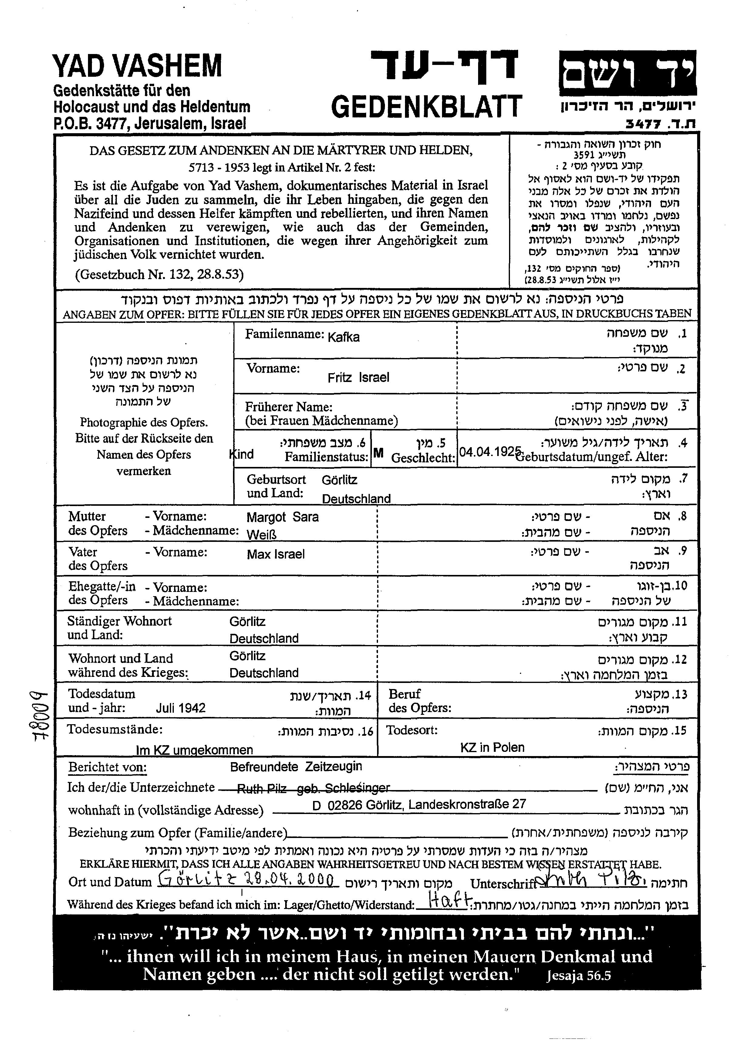 Kafka Fritz Israel 1925 Goerlitz, Deutsches Reich Gedenkblatt
