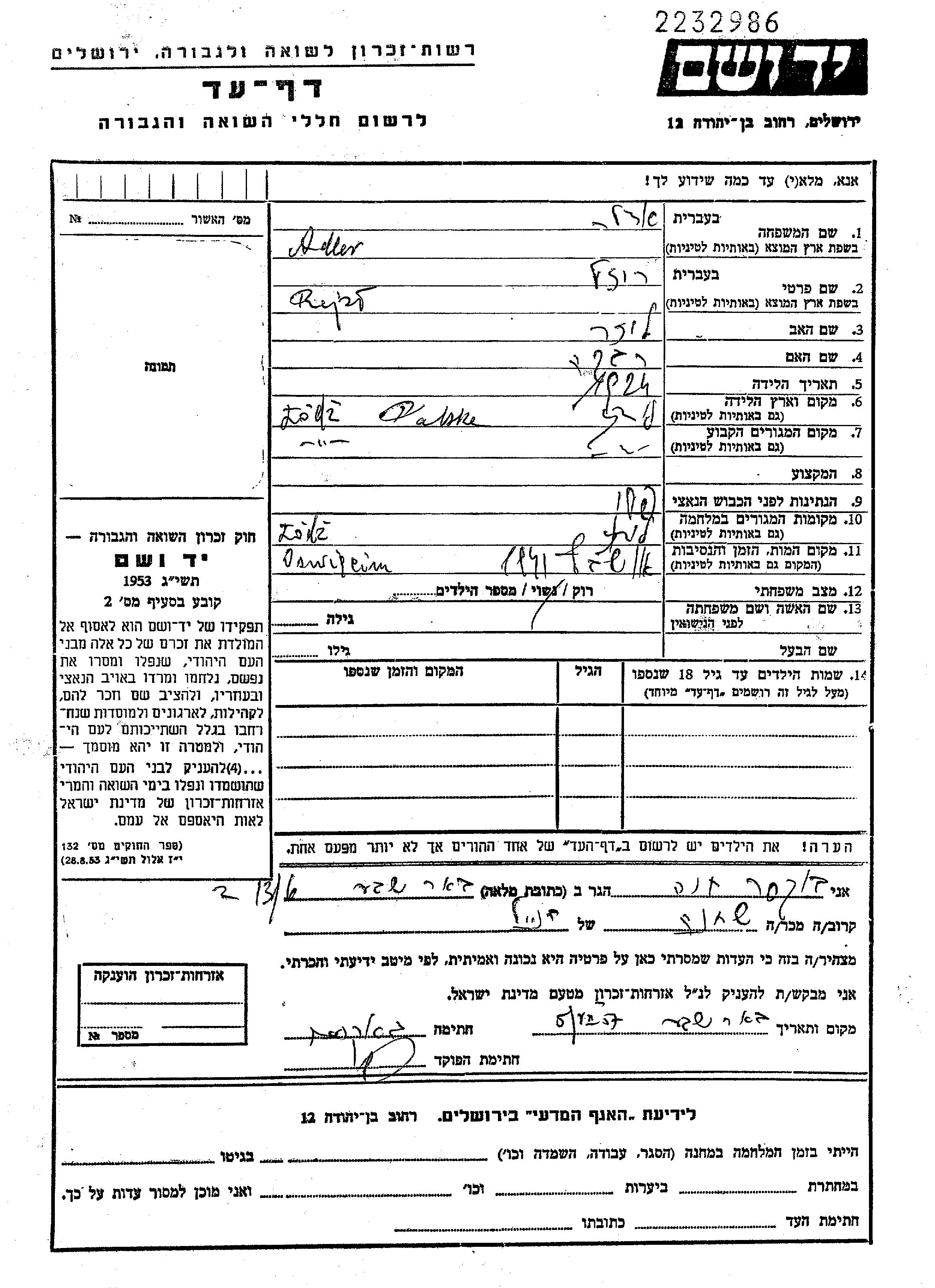 Rejzl Adler wurde im Jahr 1924 in Lodz, Polen geboren. Vor dem Zweiten Weltkrieg lebte sie in Lodz, Polen.