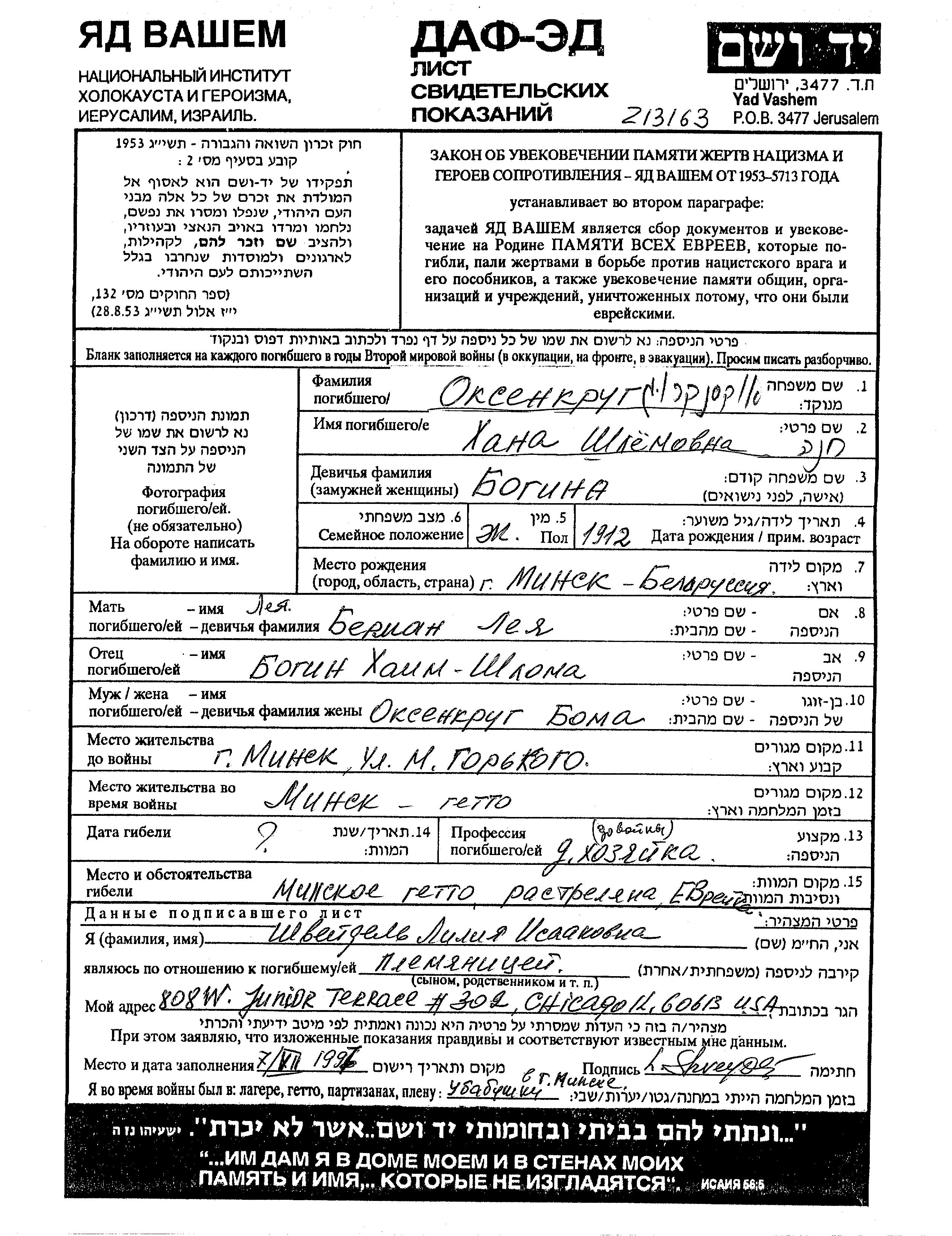 Khana Bogin Oksenkrug, geb. Bogin wurde im Jahr 1912 in Minsk, Weißrussland (UdSSR) geboren. Sie war Hausfrau. Vor dem Zweiten Weltkrieg lebte sie in Minsk, Weißrussland (UdSSR).