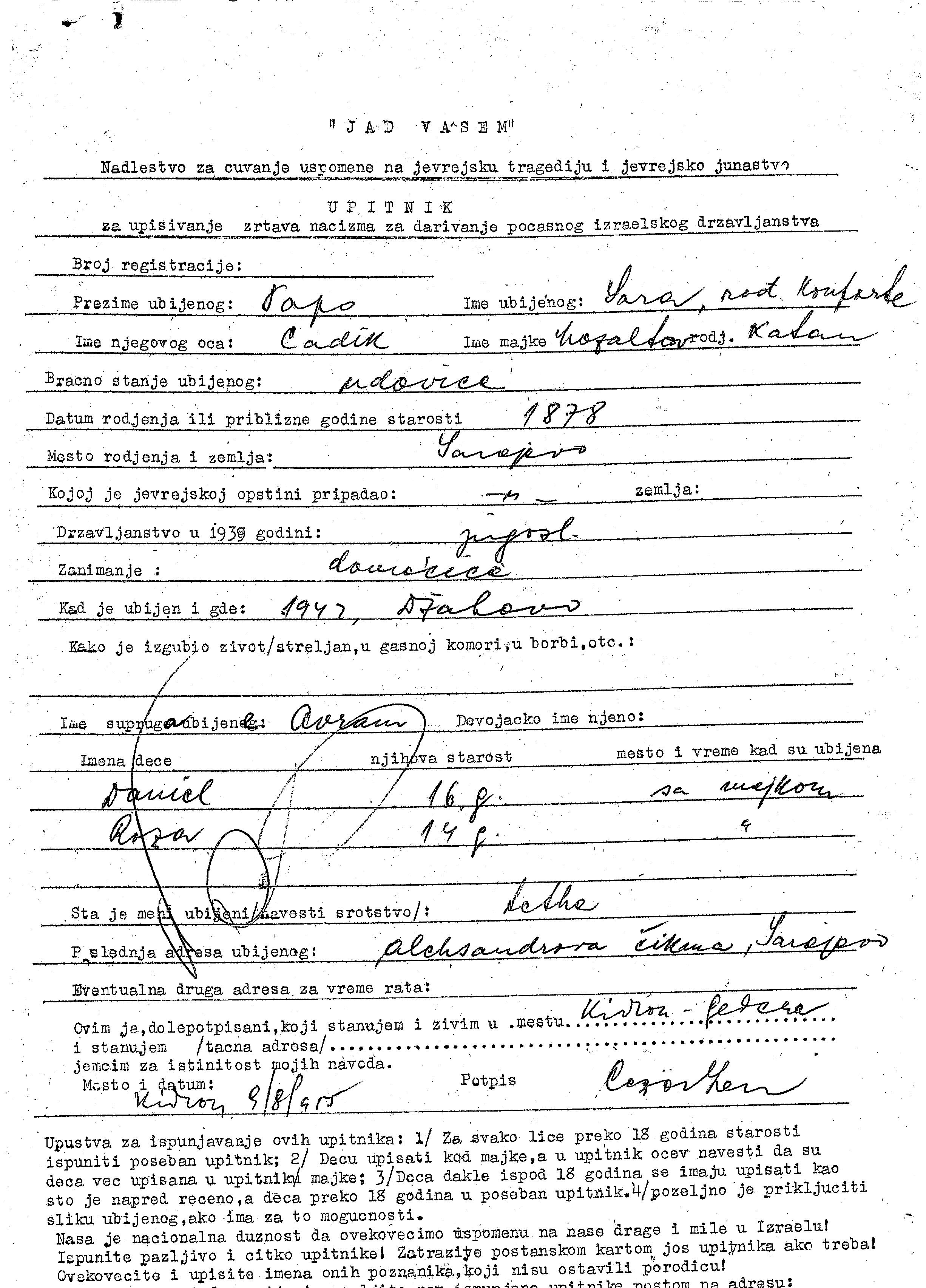 Sara Papo, geb. Konforte wurde im Jahr 1878 in Sarajevo, Jugoslawien geboren. Sie war Hausfrau. Vor dem Zweiten Weltkrieg lebte sie in Sarajevo, Jugoslawien.