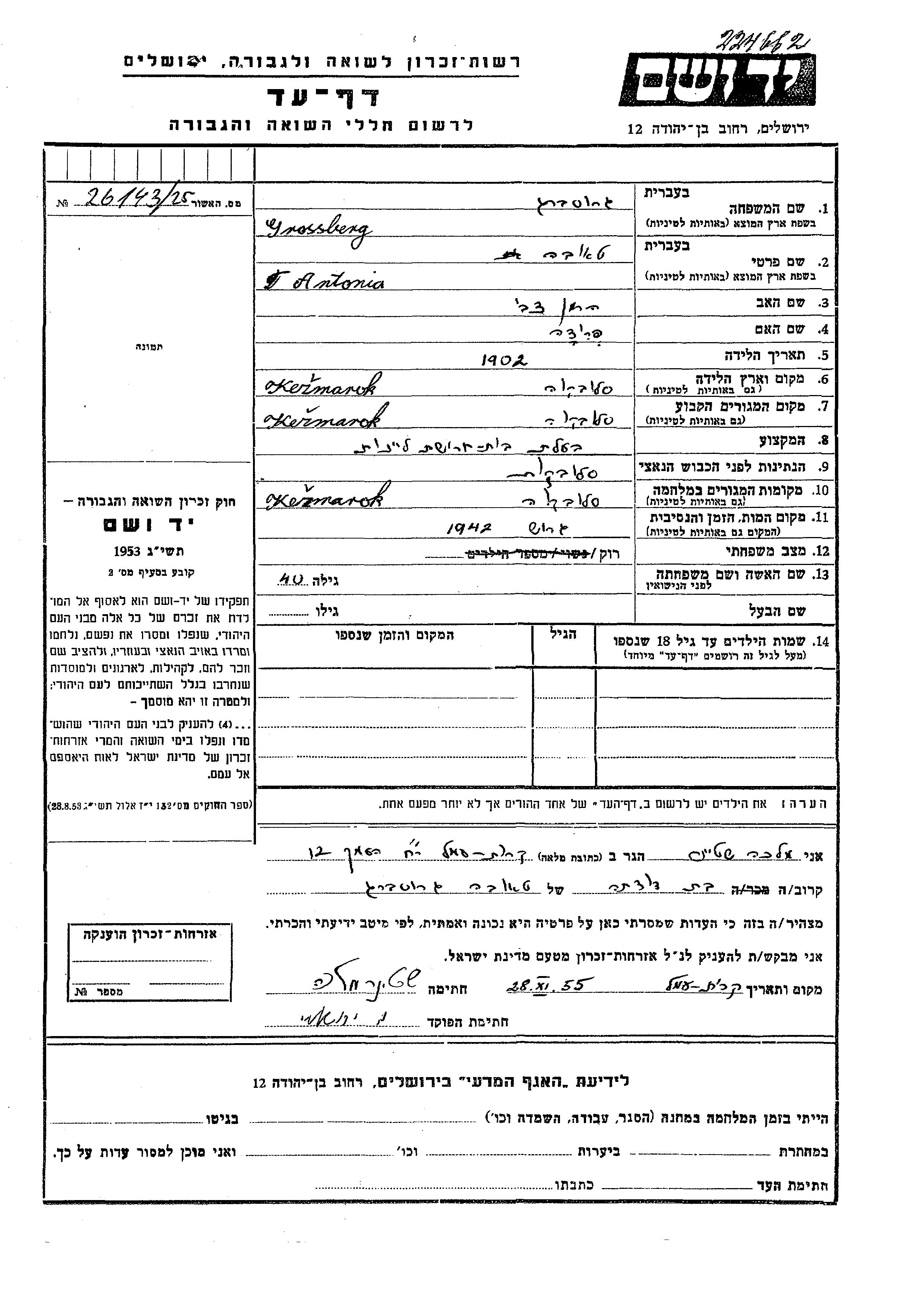 Antonia Tauba Grossberg wurde im Jahr 1902 in Kesmark, Tschechoslowakei geboren. Sie war die Tochter von Herman Tzvi und Frida. Sie war בעלת בית חרושת ליינו und Ledig. Vor dem Zweiten Weltkrieg lebte sie in Kesmark, Tschechoslowakei. Während des Krieges war sie in Kesmark, Tschechoslowakei.
