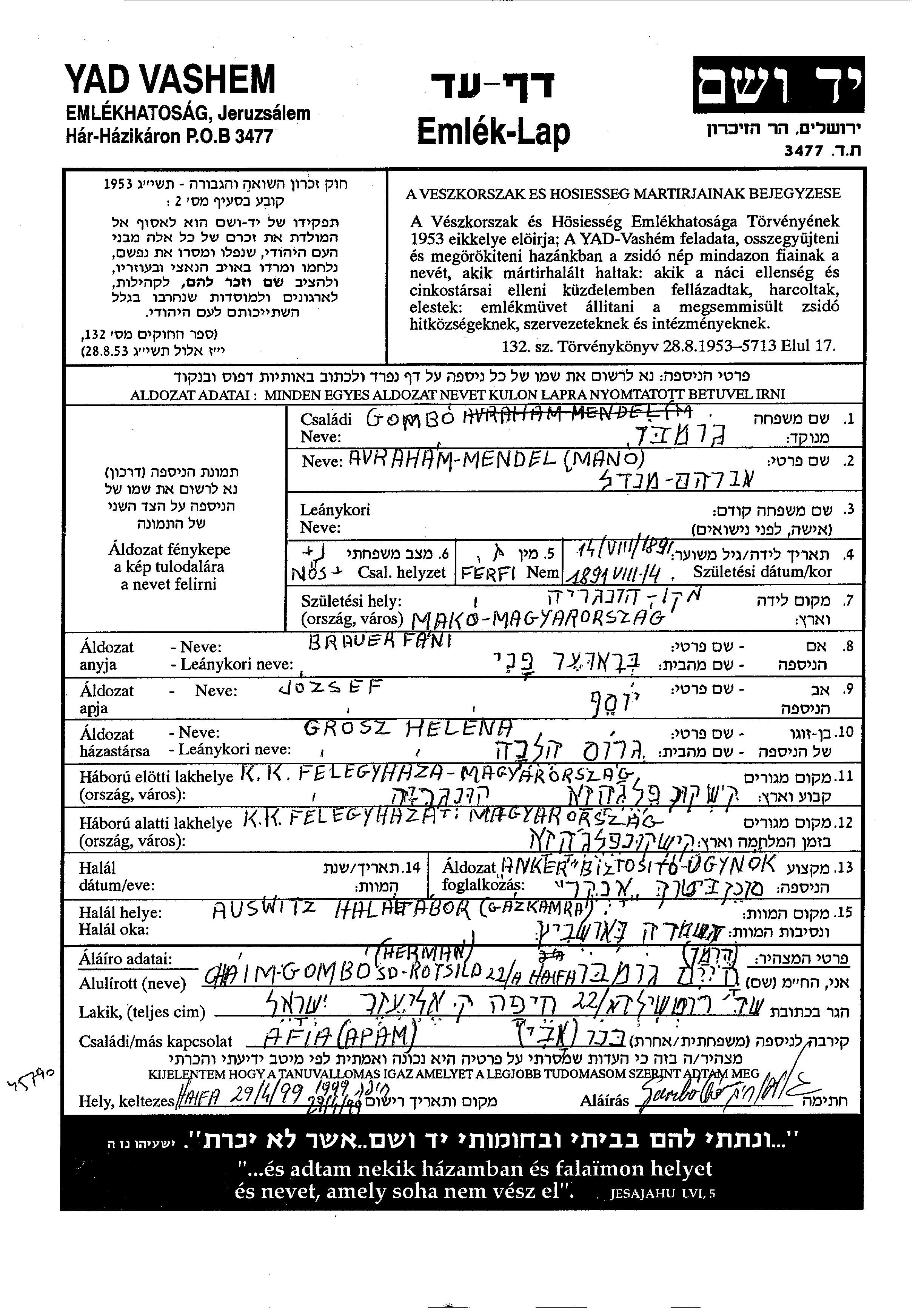 Gombo | Mendl Avraham | 1891 | Kiskunfelegyhaza, Ungarn | Gedenkblatt |