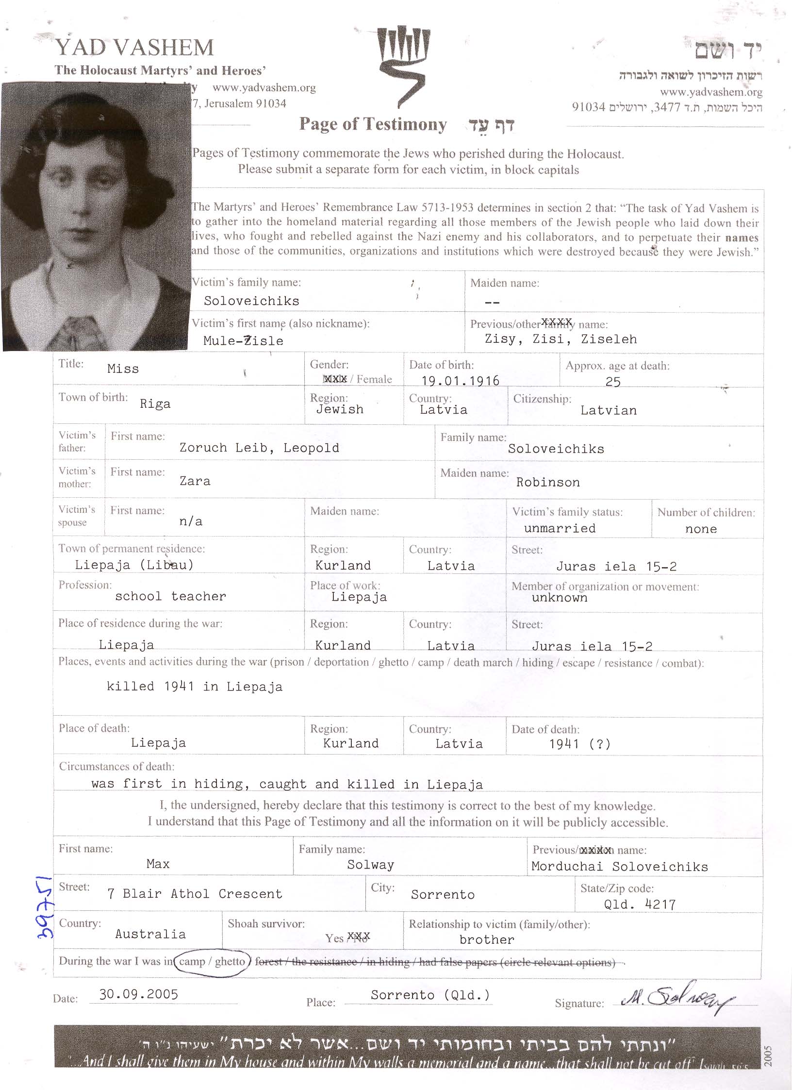Zisy Mule Soloweiczyk wurde im Jahr 1916 in Riga, Lettland geboren. Er war Lehrer/in. Vor dem Zweiten Weltkrieg lebte er in Liepaja, Lettland.