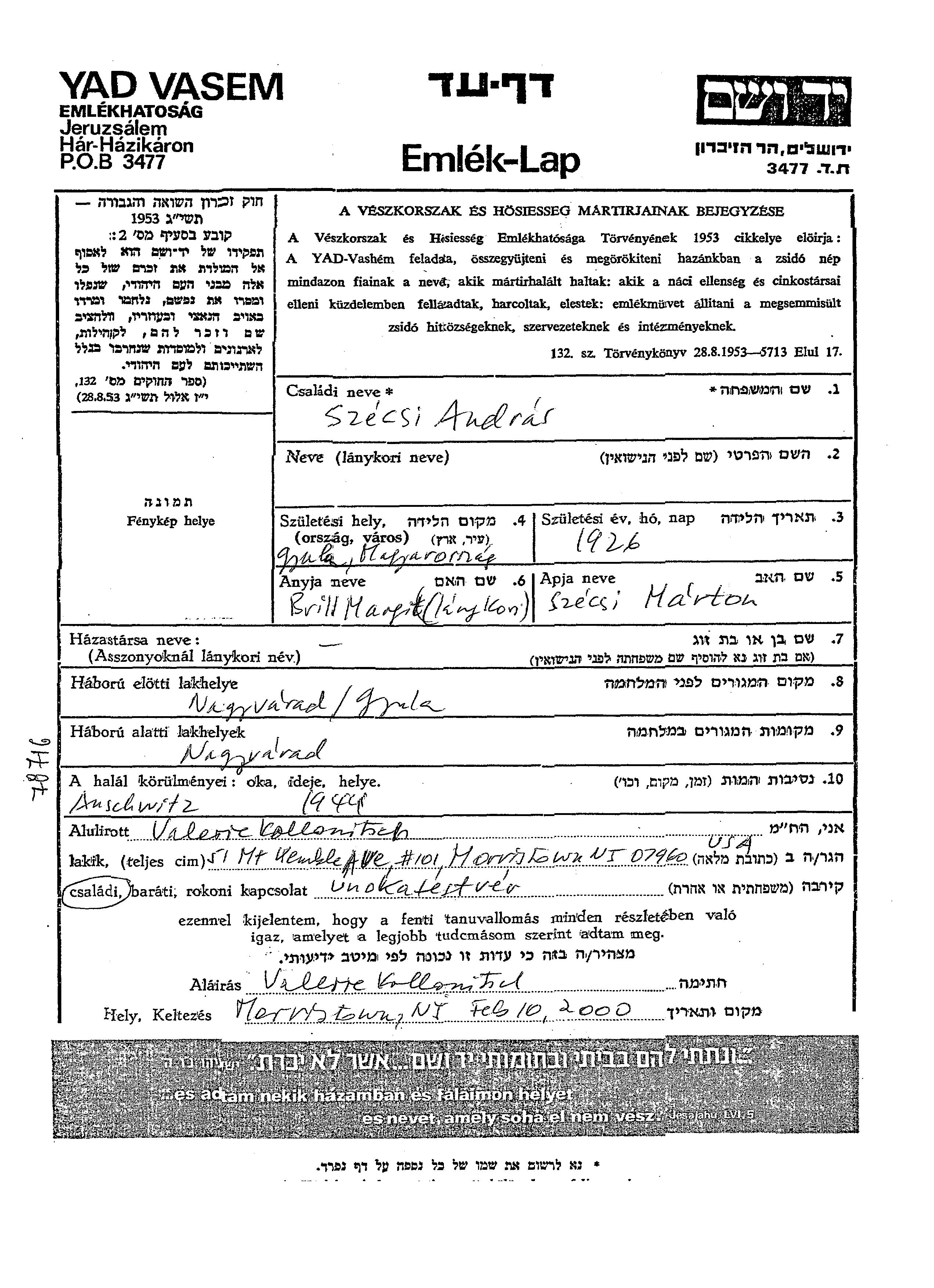 Szecsi Brill | Andras | 1926 | Gyula, Ungarn | Gedenkblatt |