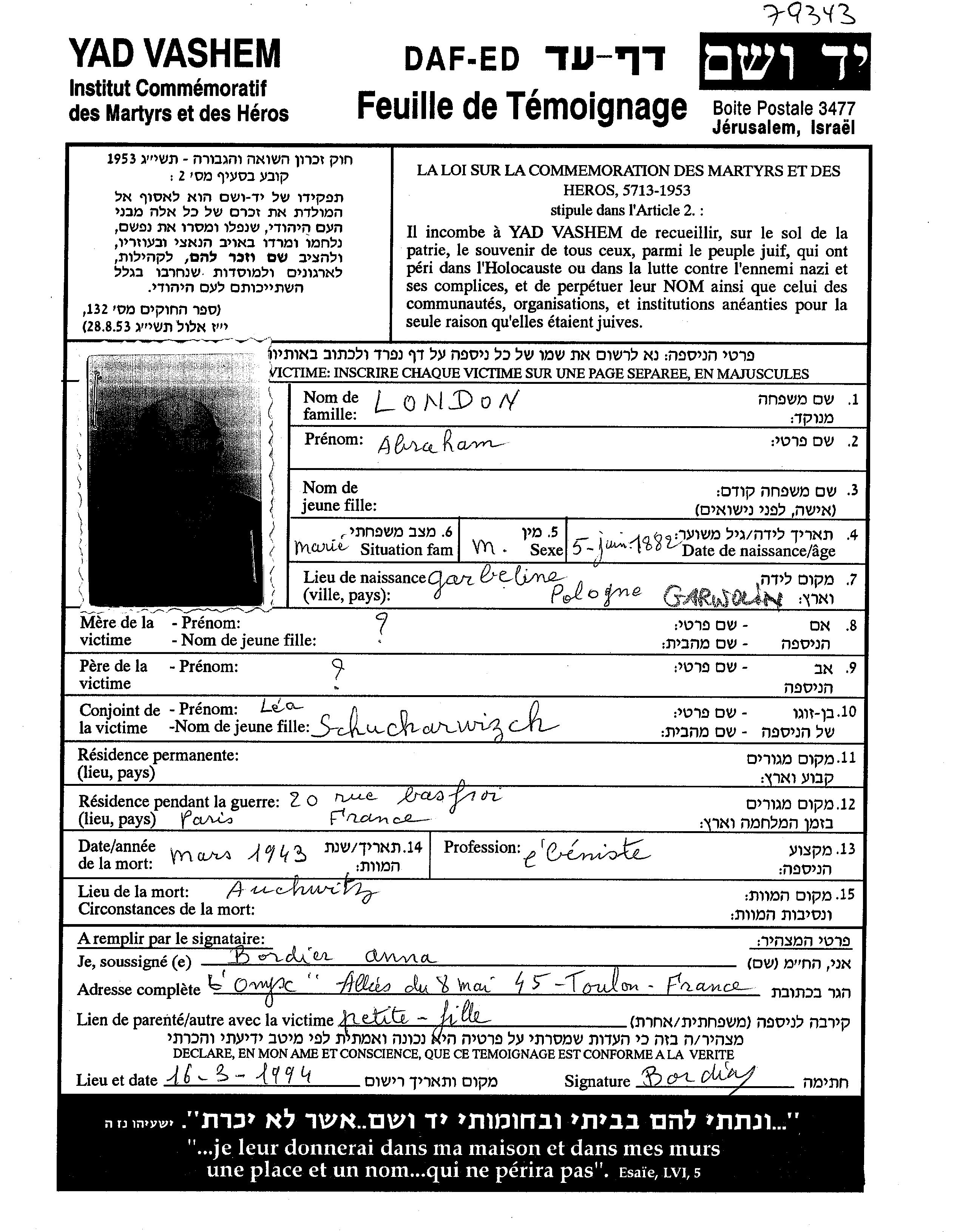 Avraham London wurde im Jahr 1882 in Garwolin, Polen geboren. Er war Zimmermann. Vor dem Zweiten Weltkrieg lebte er in Paris, Frankreich.