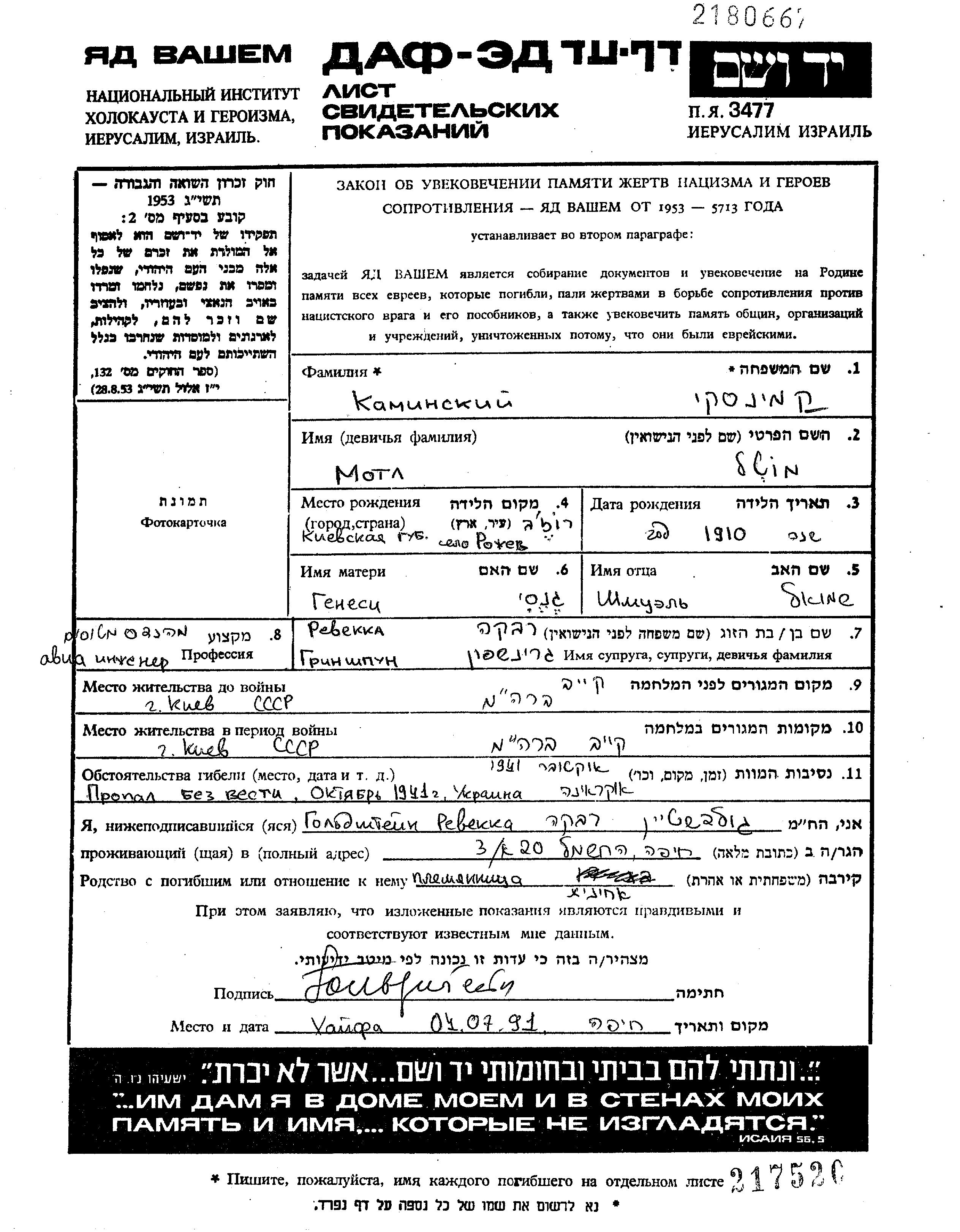 Motl Kaminskiy wurde im Jahr 1910 in Rozhev, Ukraine (UdSSR) geboren. Vor dem Zweiten Weltkrieg lebte er in Kiev, Ukraine (UdSSR).