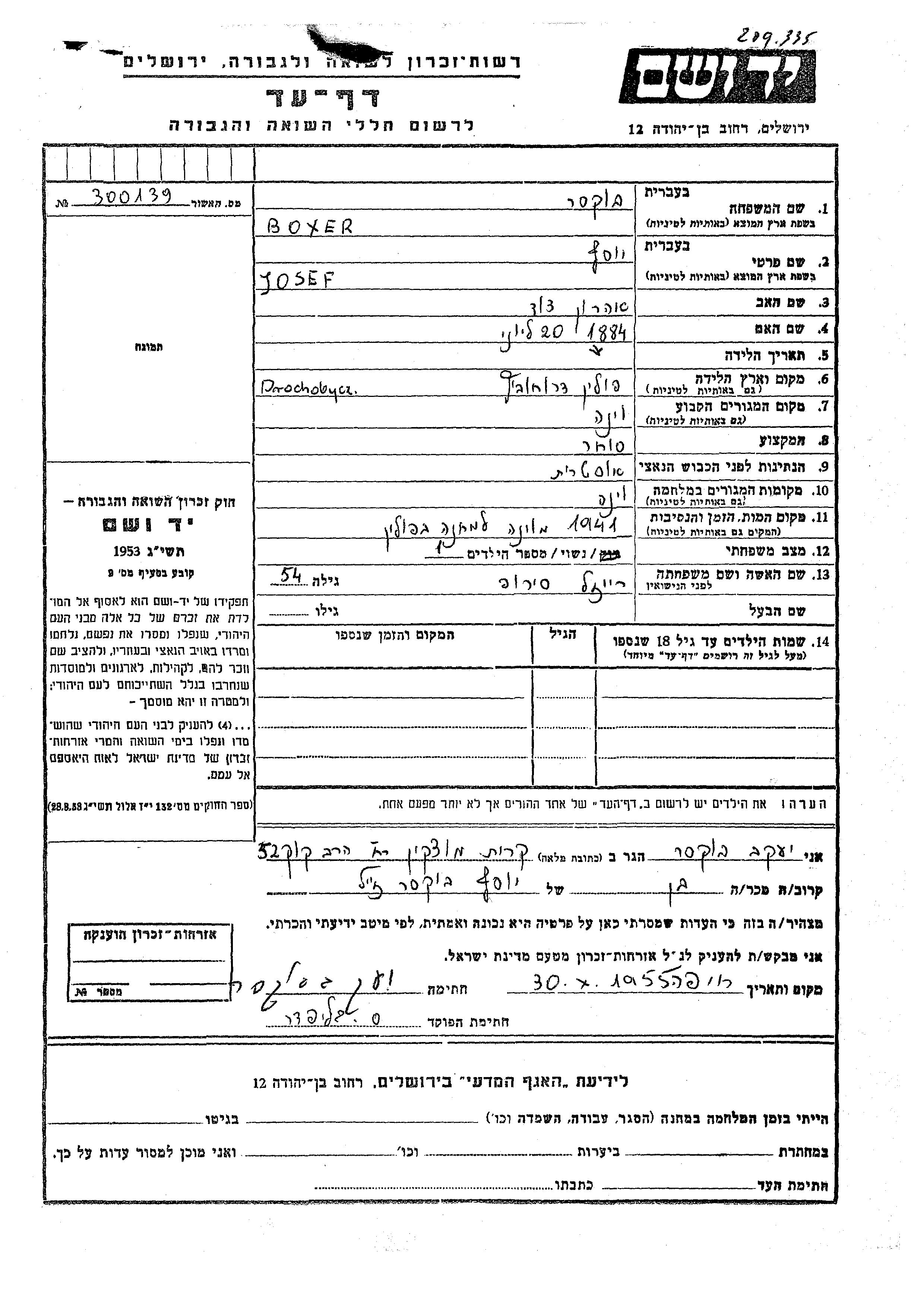 Yosef Leibisch Boxer wurde im Jahr 1884 in Drohobycz, Polen geboren. Er war Kaufmann/-frau. Vor dem Zweiten Weltkrieg lebte er in Wien, Österreich.