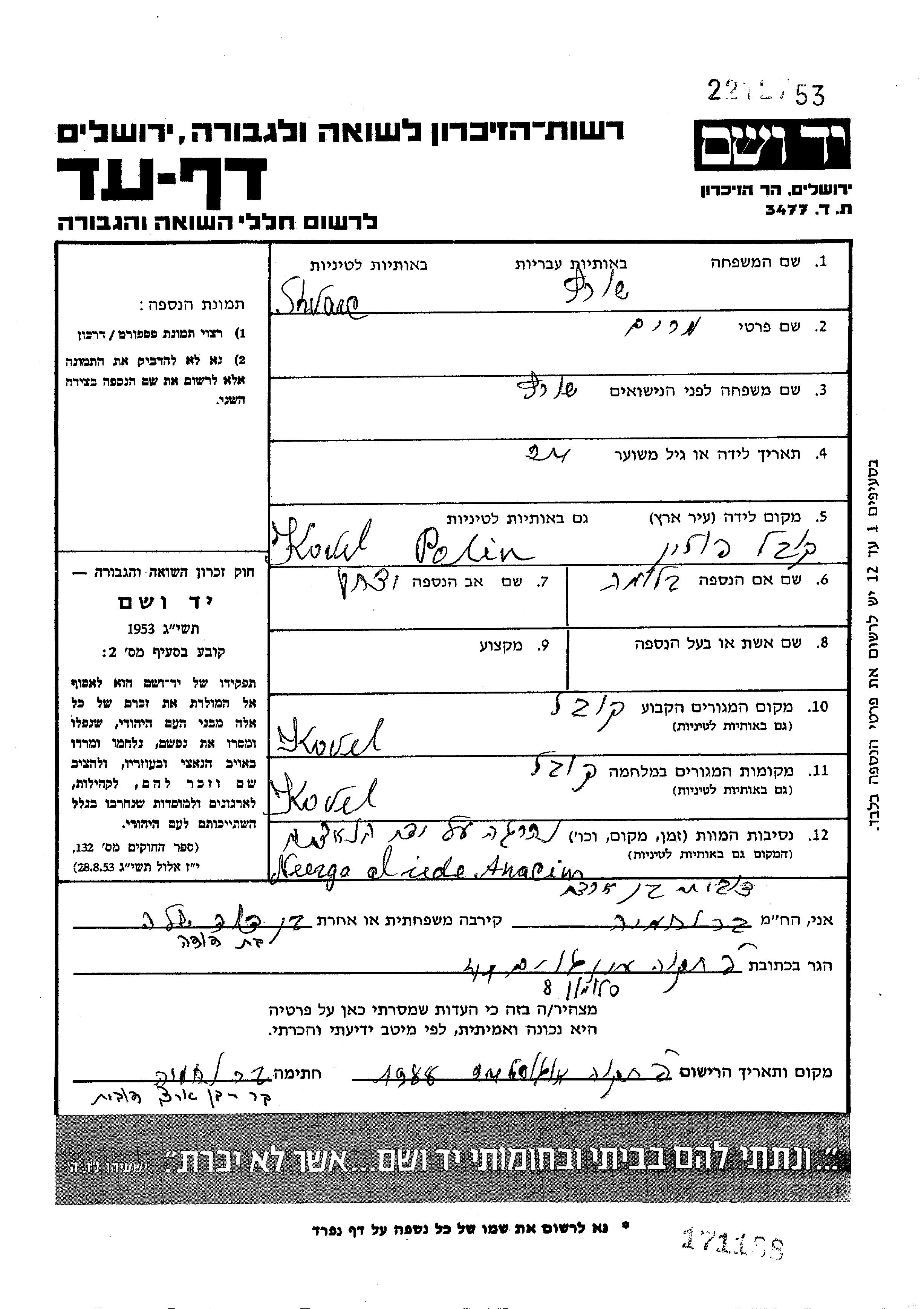 Shvarc | Miriam | Kowel, Polen | Gedenkblatt | |