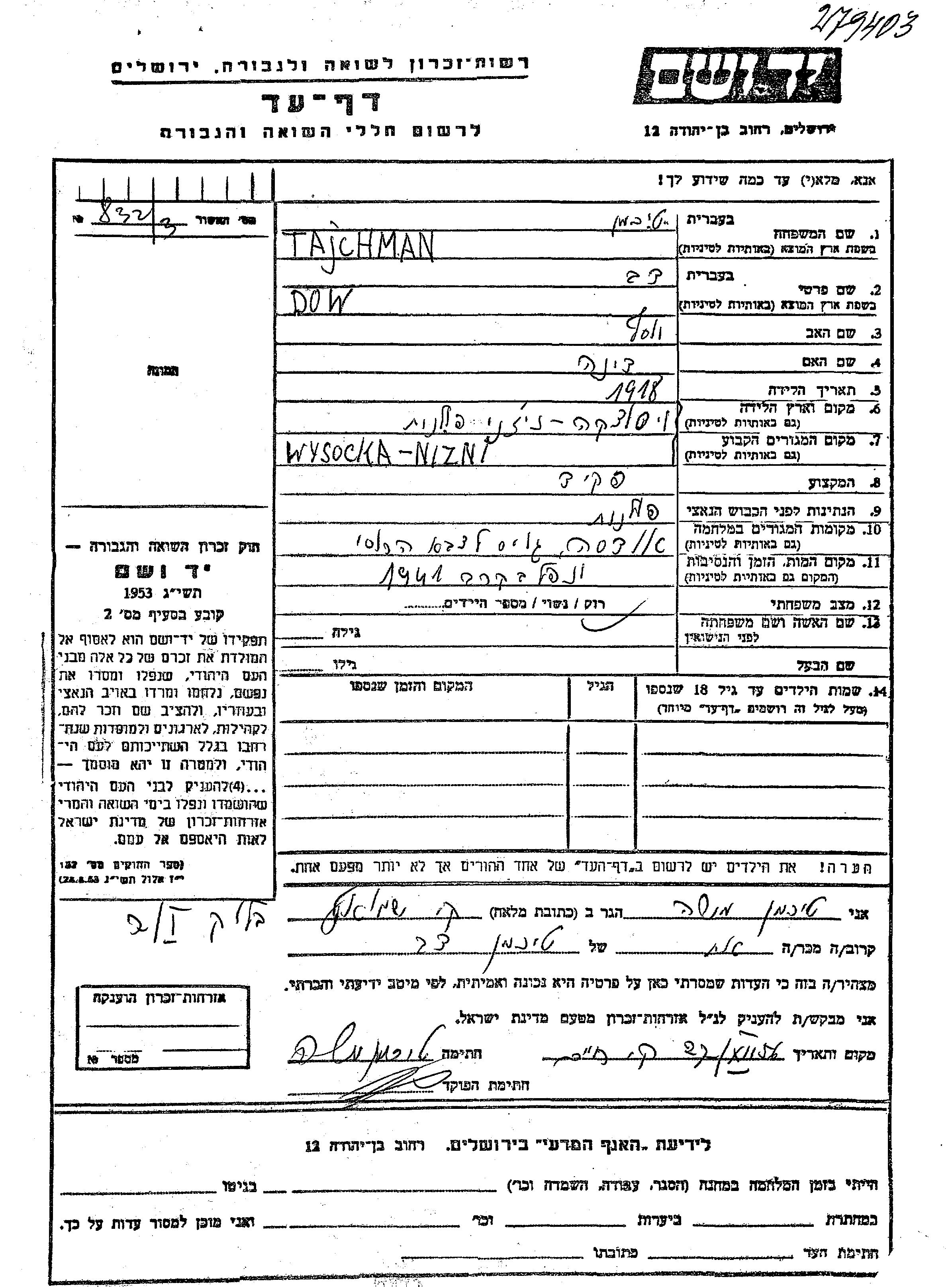 Dov Ber Taichman wurde im Jahr 1870 in Balti, Rumänien geboren. Er war Angestellte/-r. Vor dem Zweiten Weltkrieg lebte er in Oświęcim, Polen.