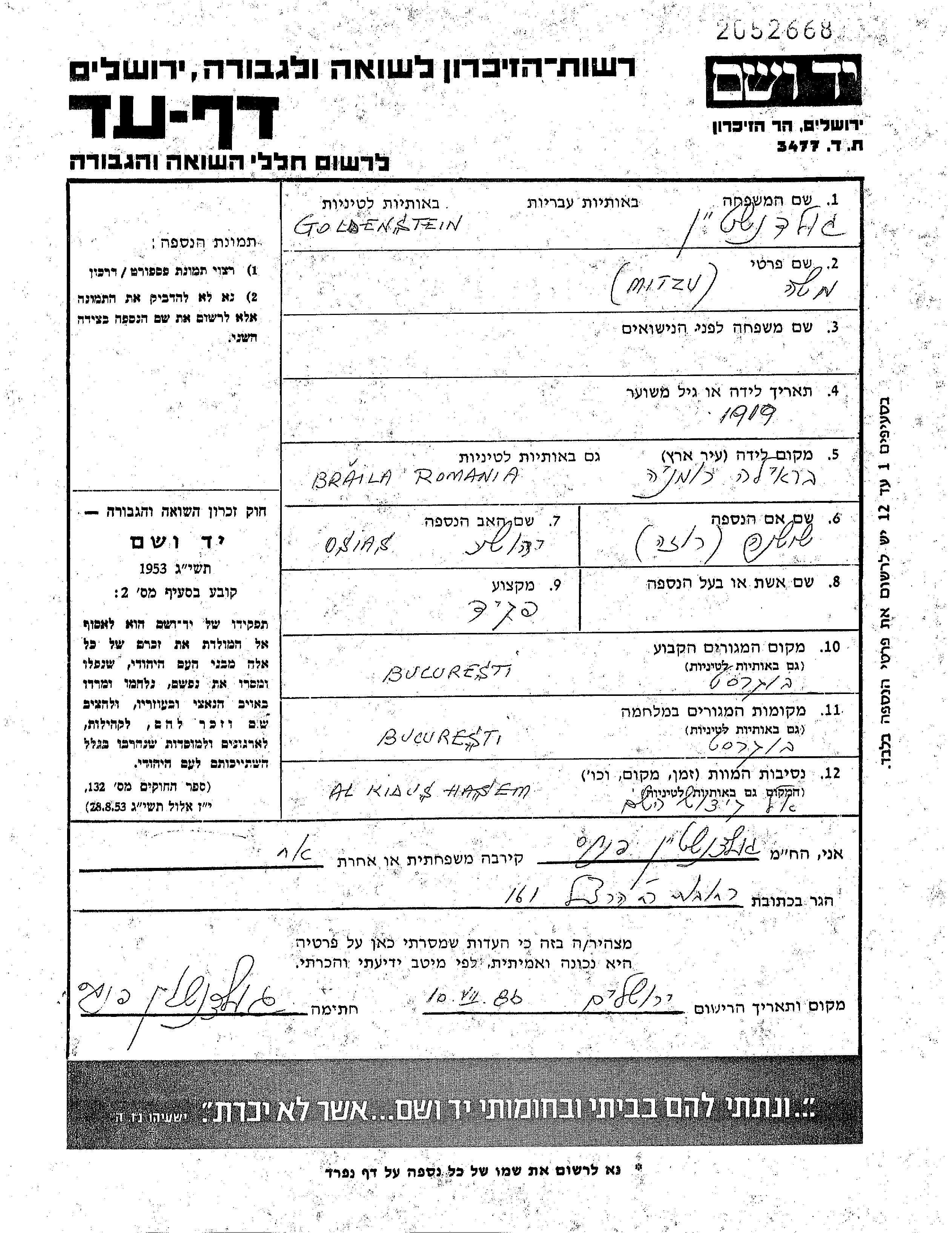 Goldenshtein | Moshe | Bucuresti, Rumänien | Gedenkblatt |