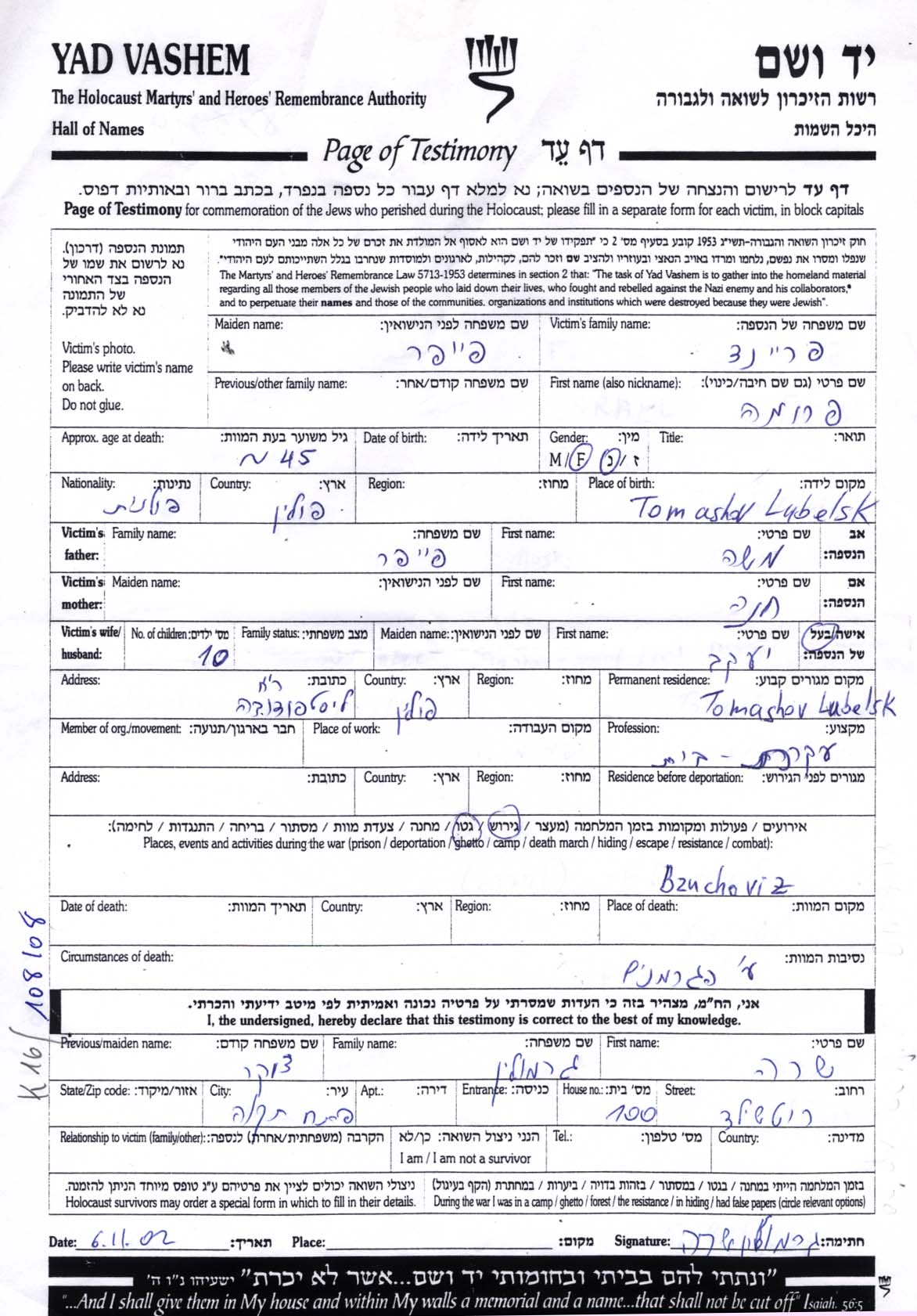 Frimet Frajnd, geb. Fajfer wurde im Jahr 1897 in Tomaszow, Polen geboren. Sie war Hausfrau. Vor dem Zweiten Weltkrieg lebte sie in Tomaszow, Polen. Frimet wurde in der Schoah ermordet. Todesort: Brzeziny, Polen im Jahr 1943.