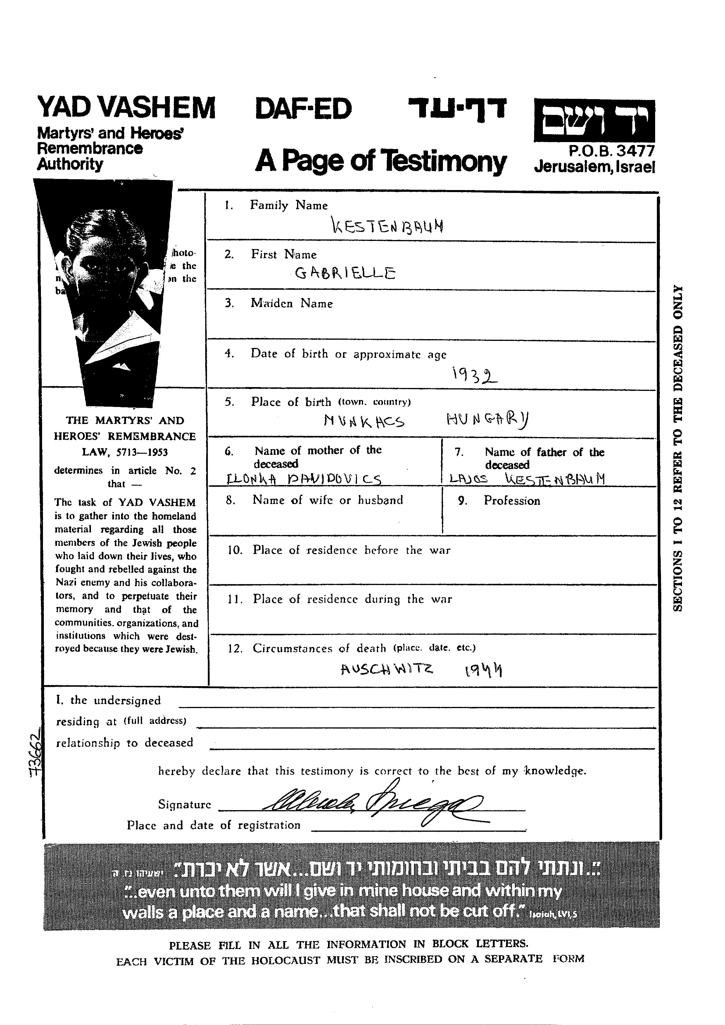 Kesztenbaum Gabriella 1932 Munkac, Tschechoslowakei Gedenkblatt