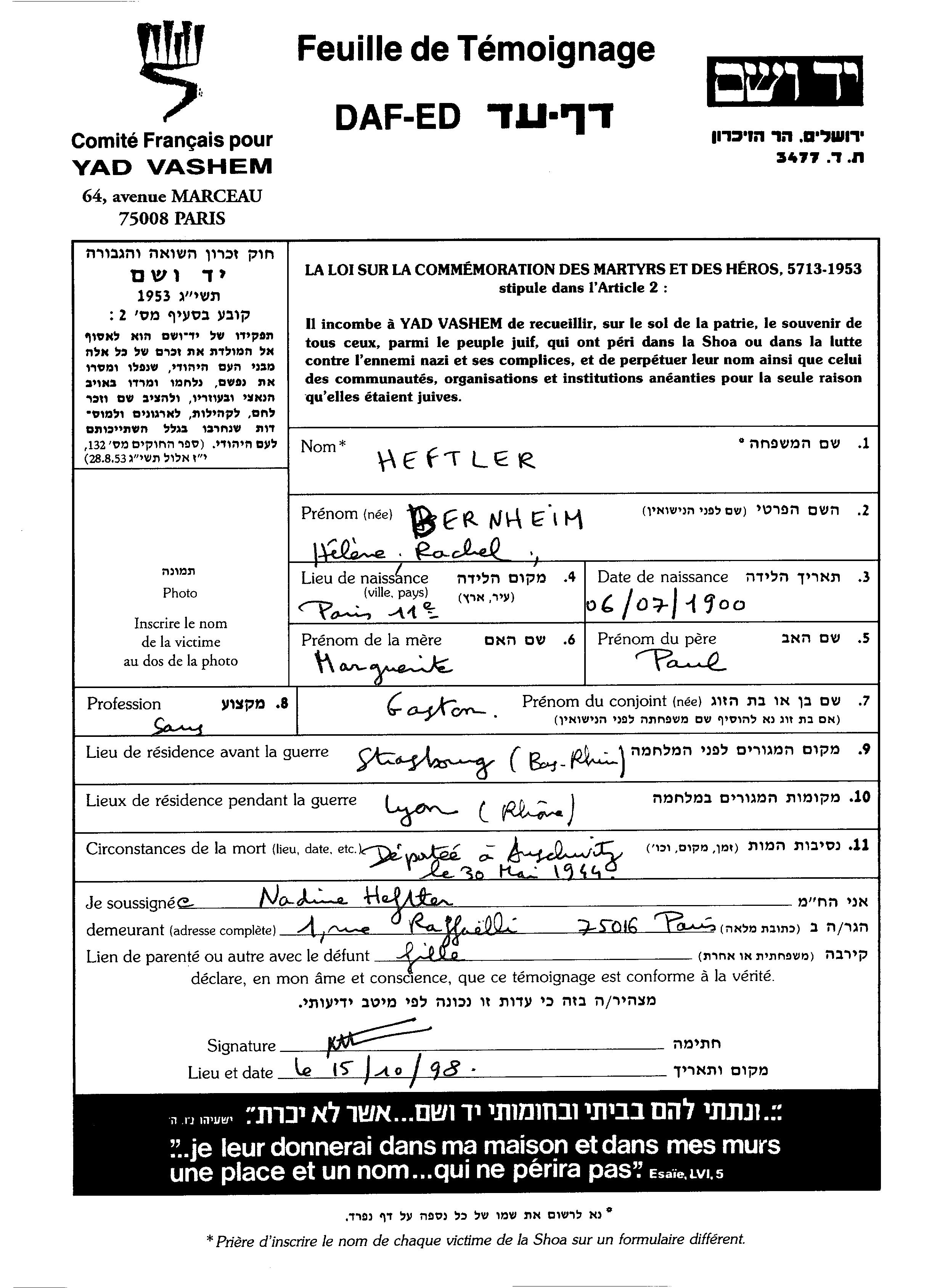 Rakhel Helene Heftler, geb. Bernheim wurde im Jahr 1900 in Paris, Frankreich geboren. Vor dem Zweiten Weltkrieg lebte sie in Strasbourg, Frankreich.