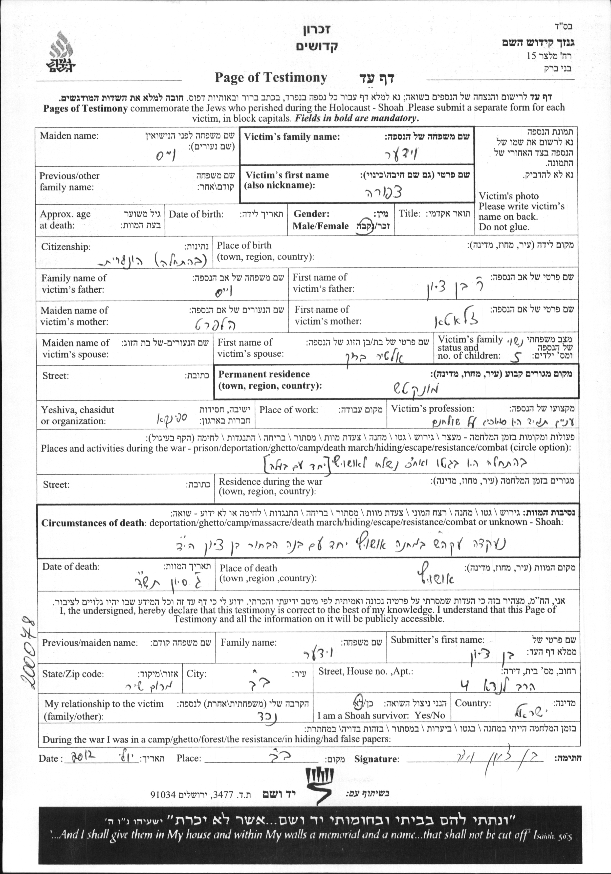 Vider | Tzipora | Munkac, Tschechoslowakei | Gedenkblatt | |