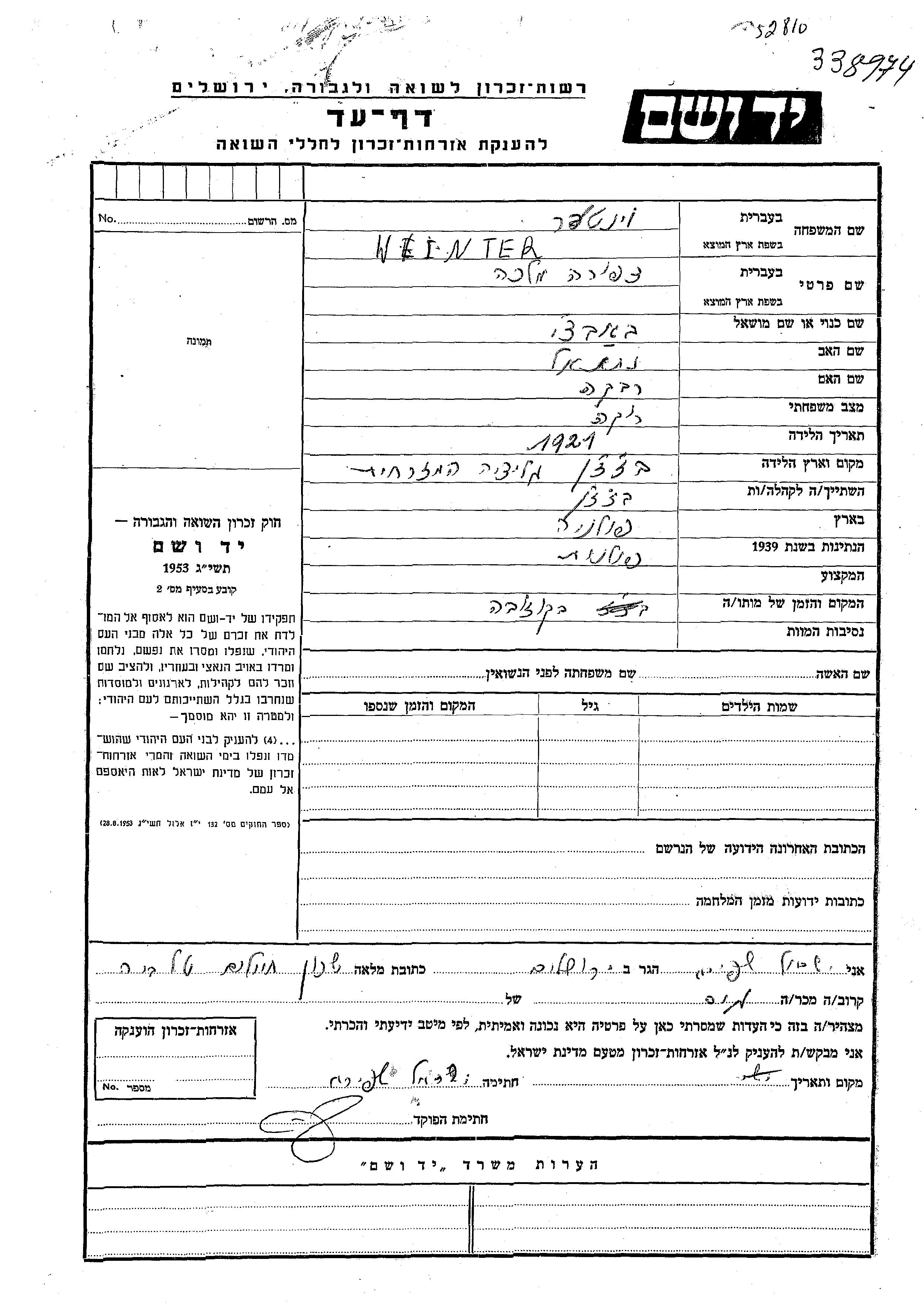 Winter Tzipora Malka 1921 unbekannter Ort, Gedenkblatt