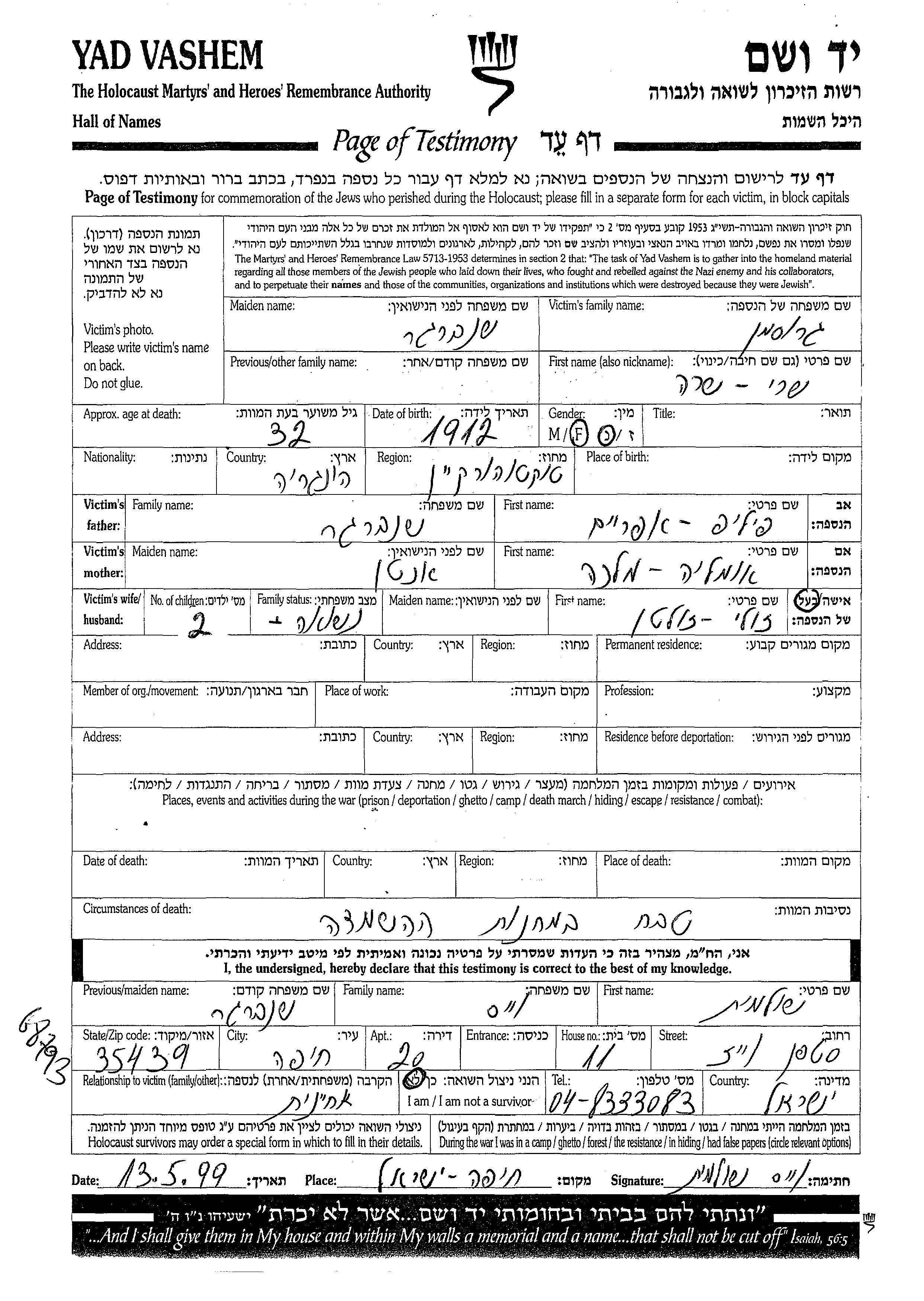 Grosman Sara 1912 Zahony, Ungarn Gedenkblatt