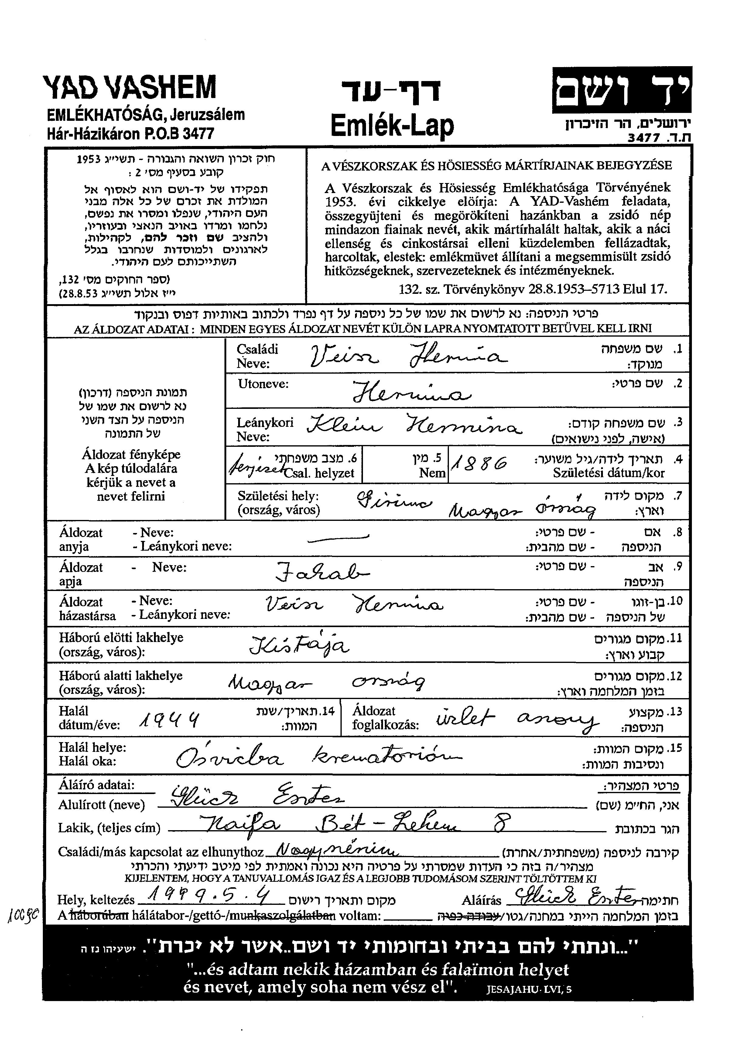Weisz Hermina 1888 Miskolc, Ungarn Liste von ermordeten Personen