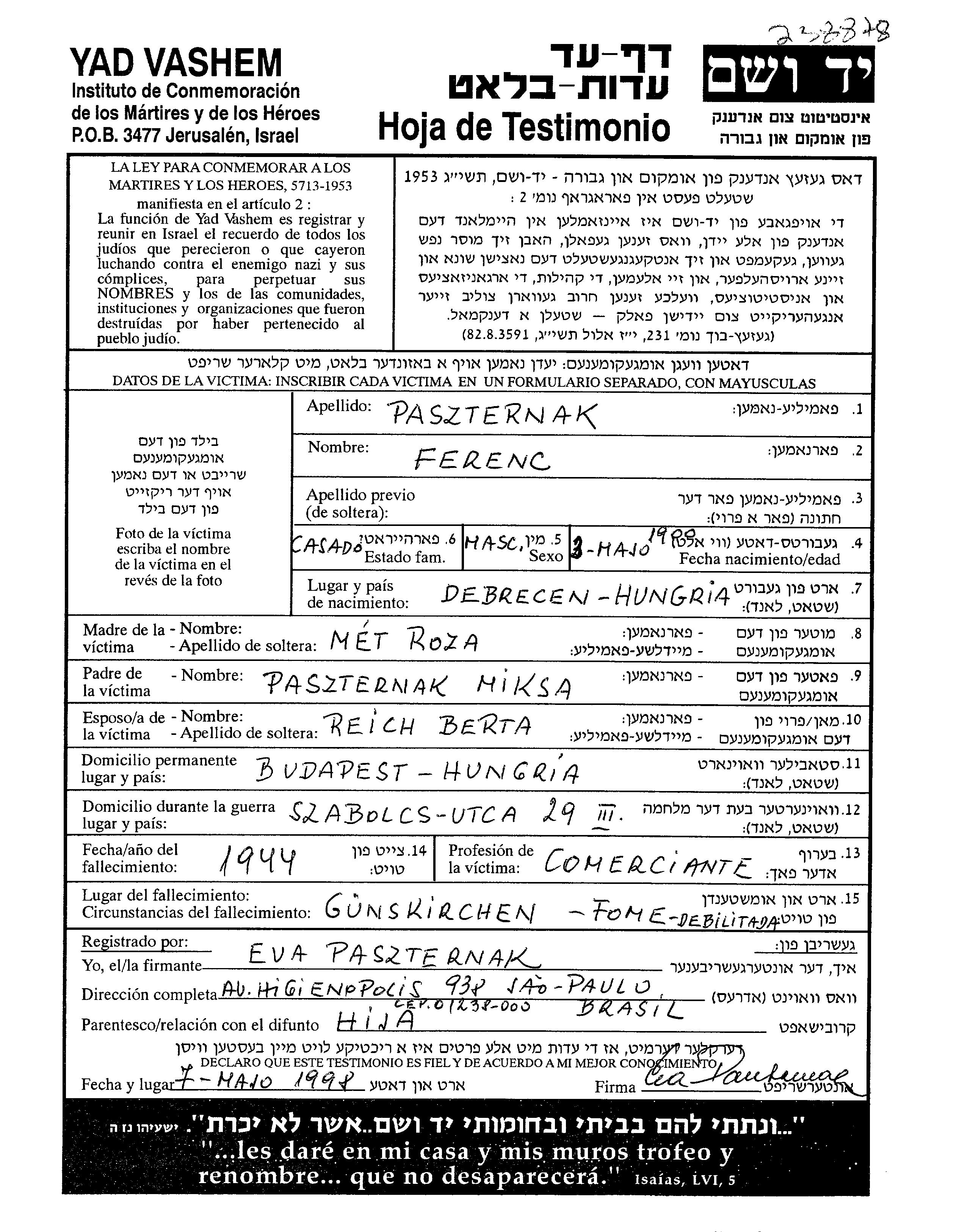 Ferentz Paszternak wurde im Jahr 1900 in Debrecen, Ungarn geboren. Er war Kaufmann/-frau. Vor dem Zweiten Weltkrieg lebte er in Budapest, Ungarn.
