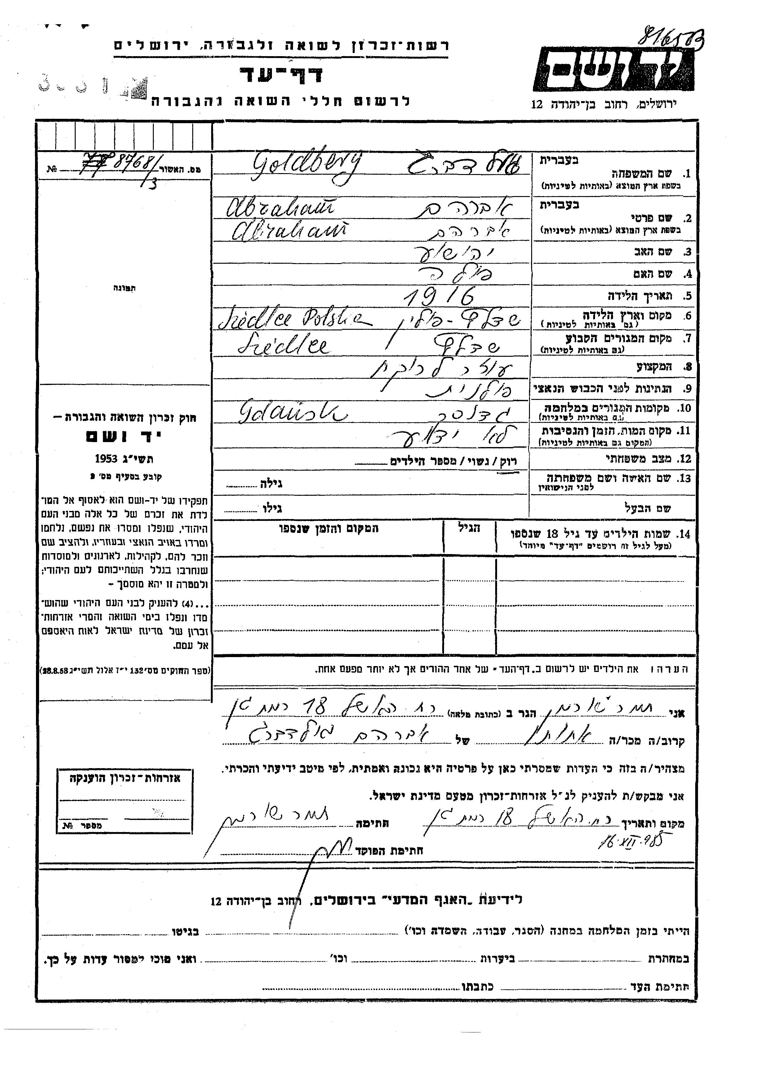Goldberg | Abraham | 1916 | Siedlec, Polen | Gedenkblatt |