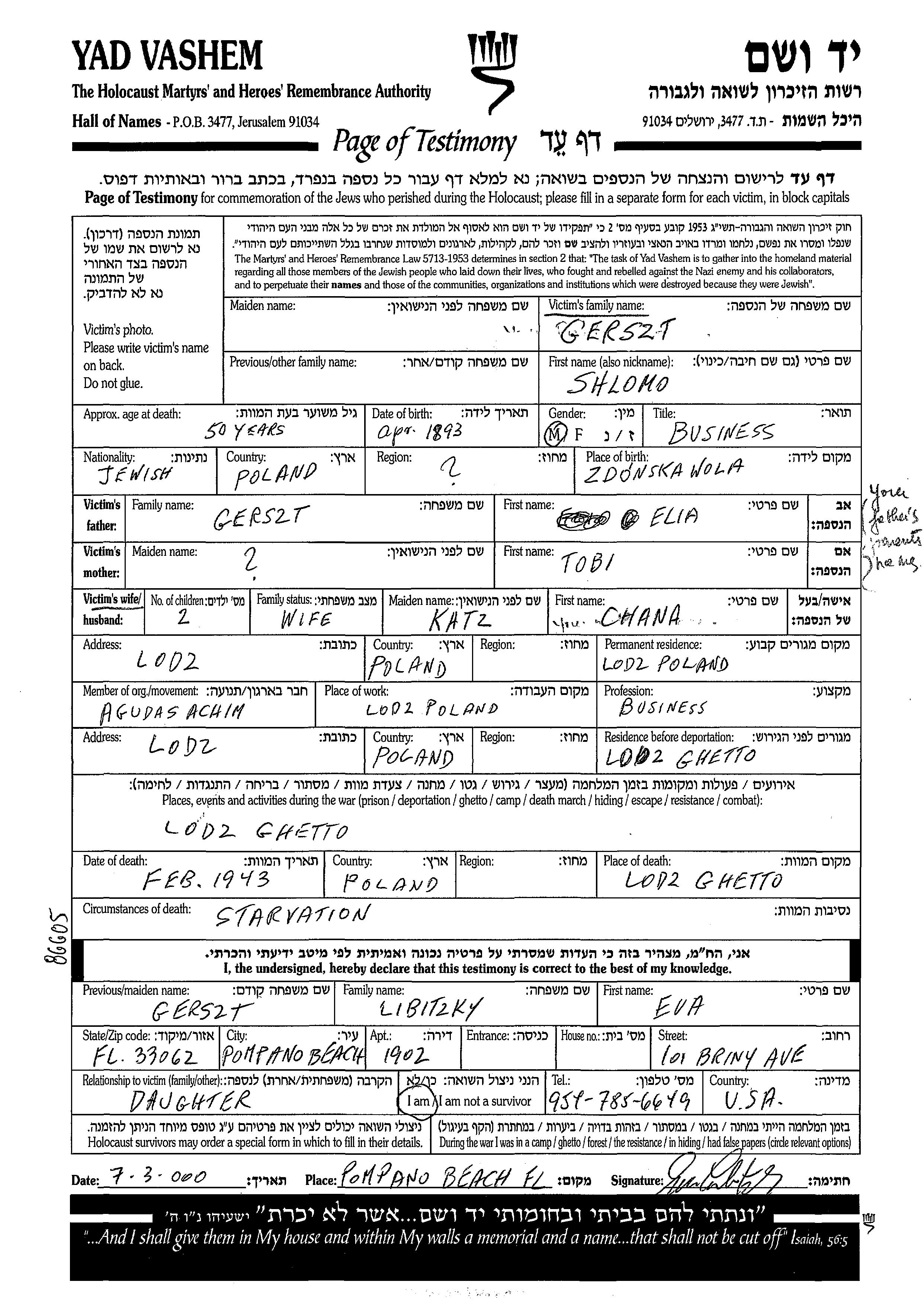 Shlomo Gerszt wurde im Jahr 1893 in Zdunska Wola, Polen geboren. Vor dem Zweiten Weltkrieg lebte er in Lodz, Polen.