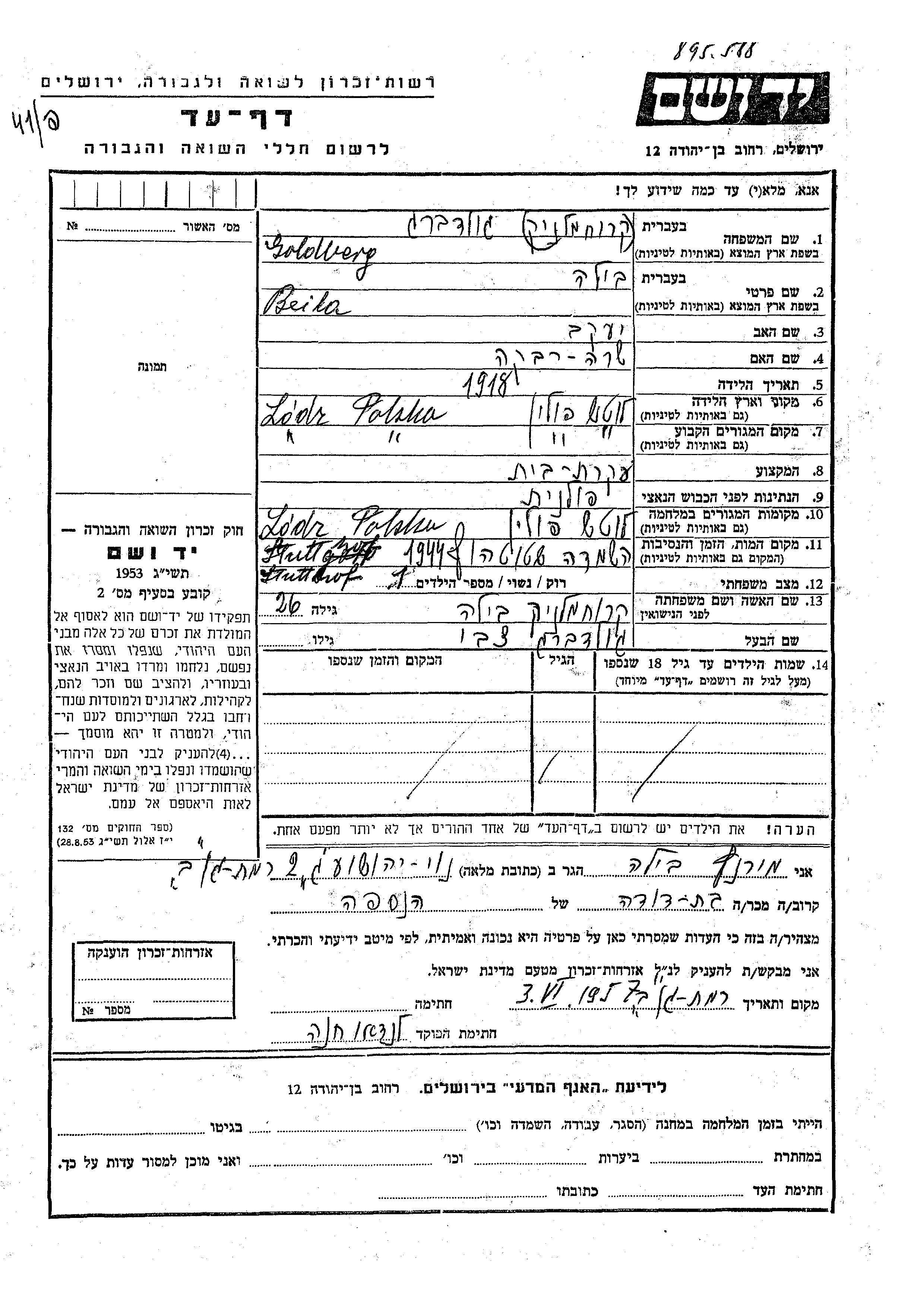 Beila Goldberg, geb. Krakhmalnik wurde im Jahr 1918 in Lodz, Polen geboren. Sie war Hausfrau. Vor dem Zweiten Weltkrieg lebte sie in Lodz, Polen.
