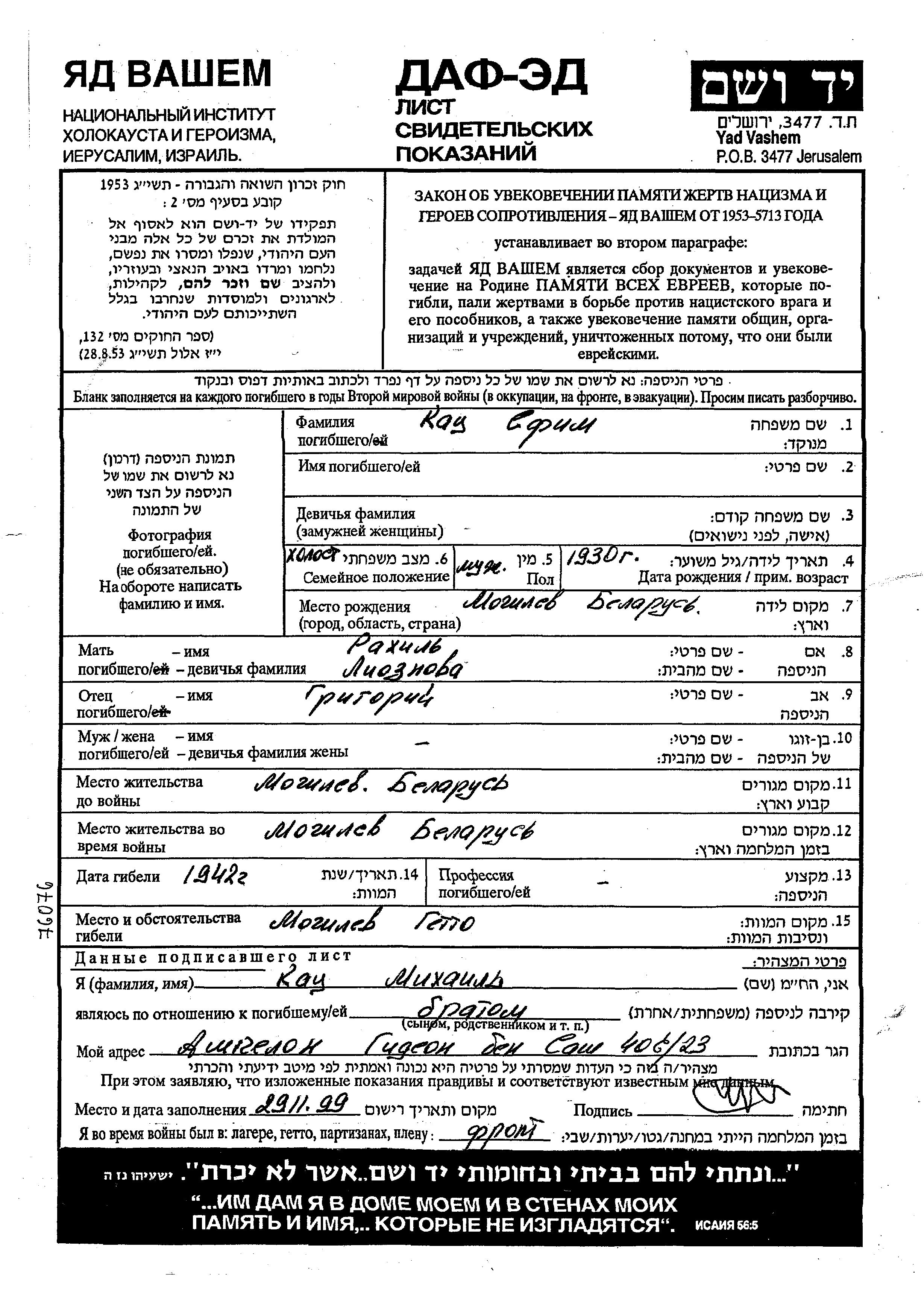 Katz Yefim 1930 Mogilev, Weißrussland (UdSSR) Gedenkblatt