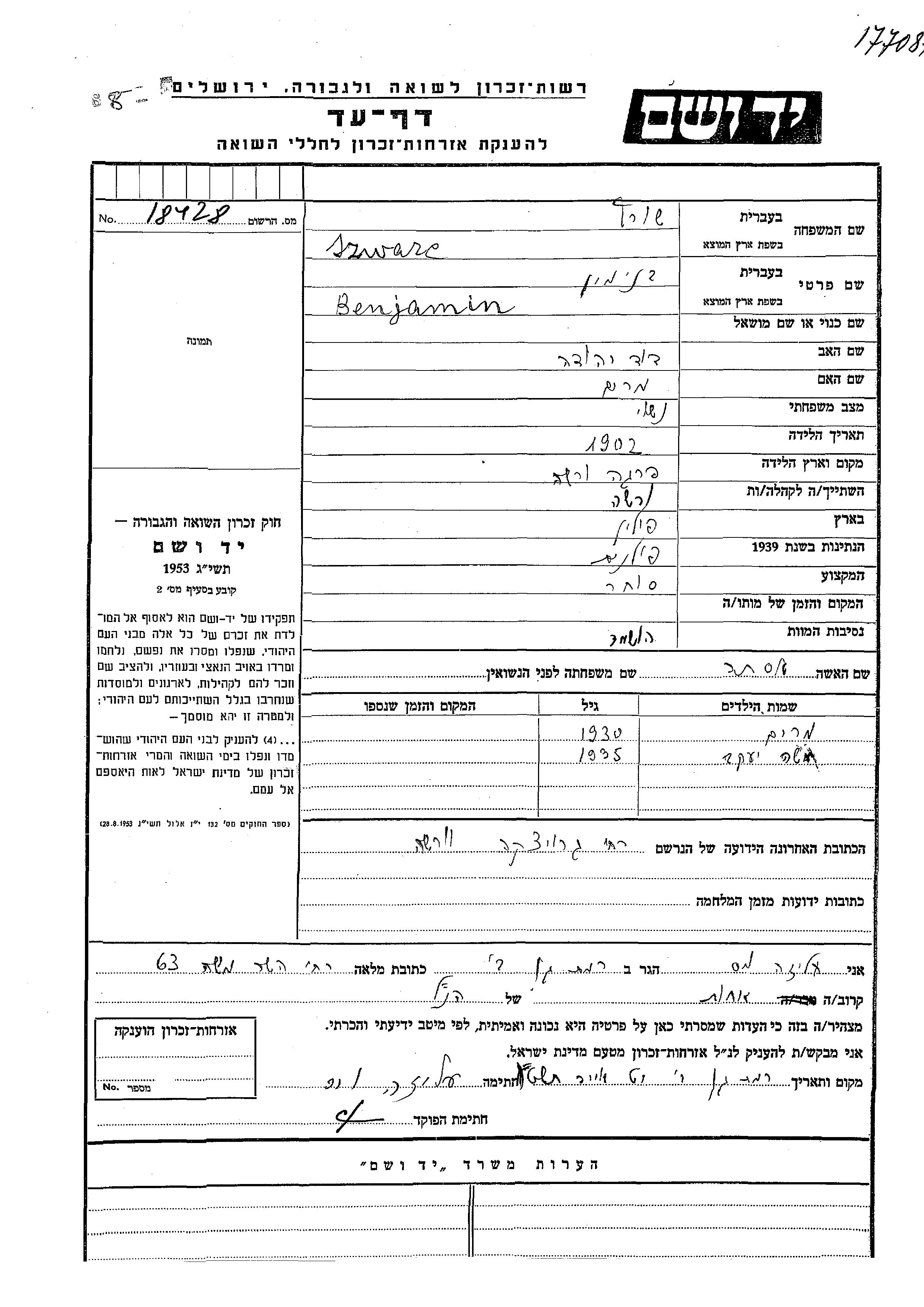 Beniamin Szwarc wurde im Jahr 1902 geboren. Er war Kaufmann/-frau. Vor dem Zweiten Weltkrieg lebte er in Warszawa, Polen.