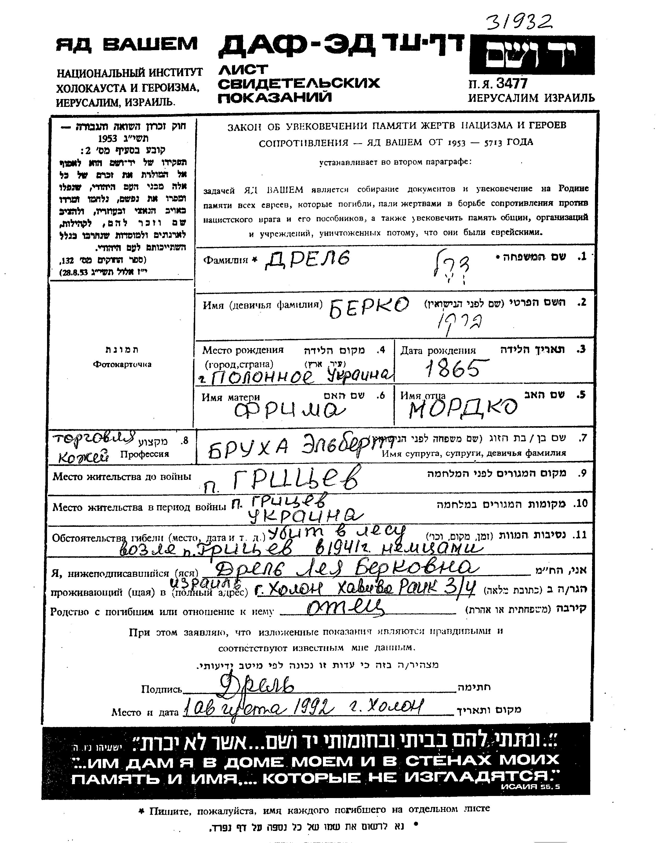 Ber Drel wurde im Jahr 1865 in Polonnoye, Ukraine (UdSSR) geboren. Er war Kaufmann/-frau. Vor dem Zweiten Weltkrieg lebte er in Gritsev, Ukraine (UdSSR).