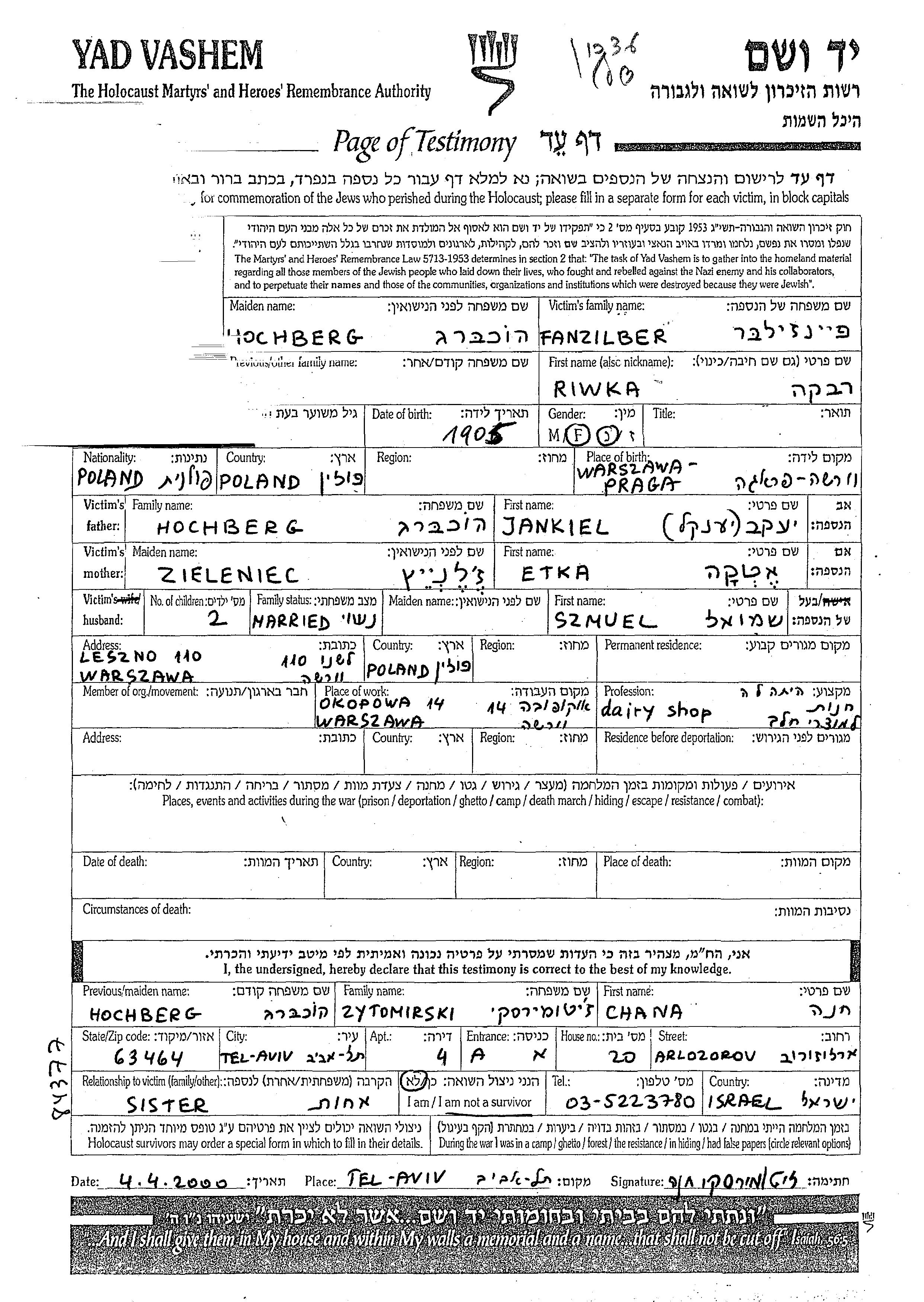 Rivka Fajnzylber, geb. Hochberg wurde im Jahr 1905 geboren. Sie war Lebensmittelhändler/-in. Vor dem Zweiten Weltkrieg lebte sie in Warszawa, Polen.
