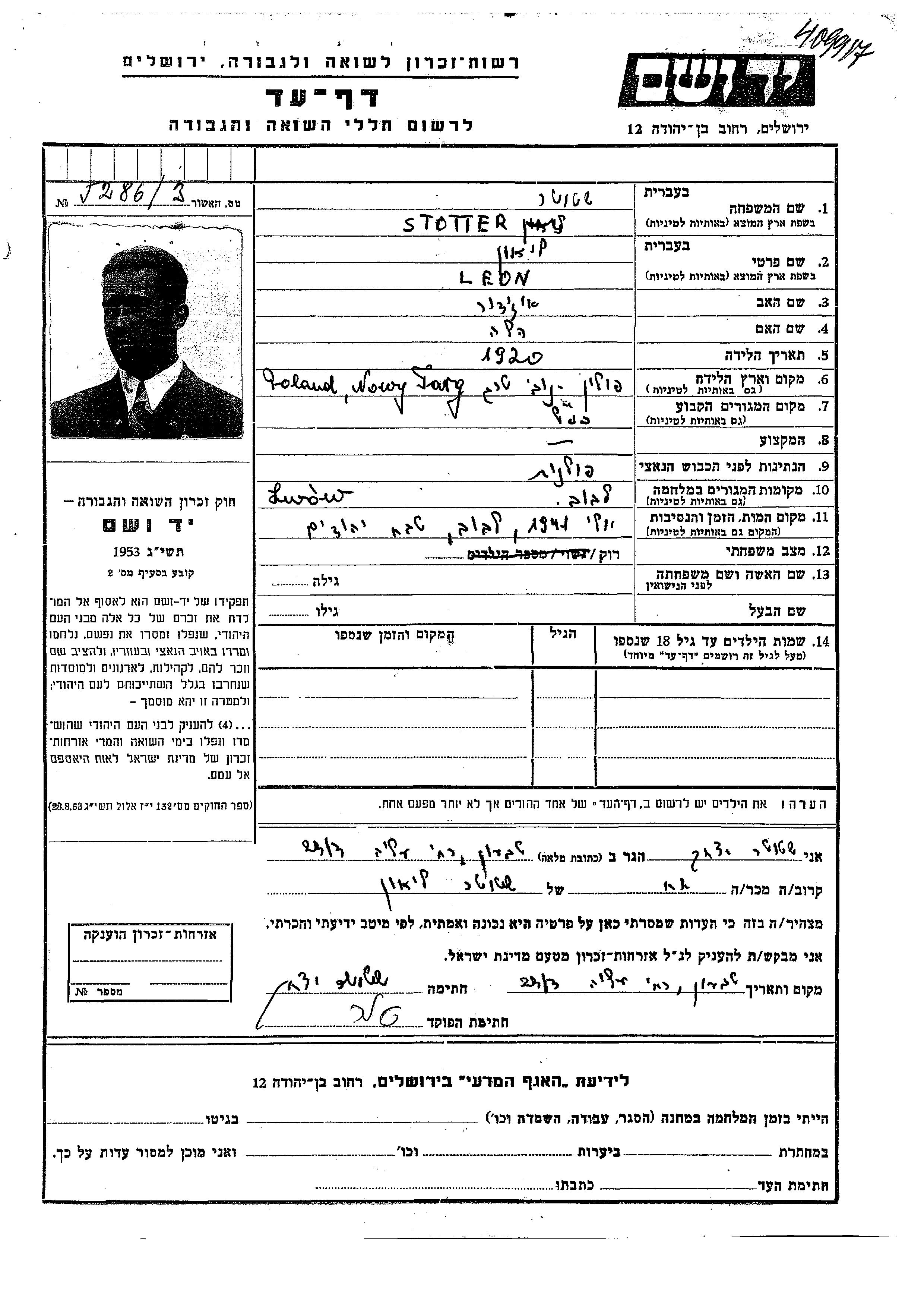 Leon Stotter wurde im Jahr 1920 in Nowy Targ, Polen geboren. Er war Student. Vor dem Zweiten Weltkrieg lebte er in Nowy Targ, Polen.