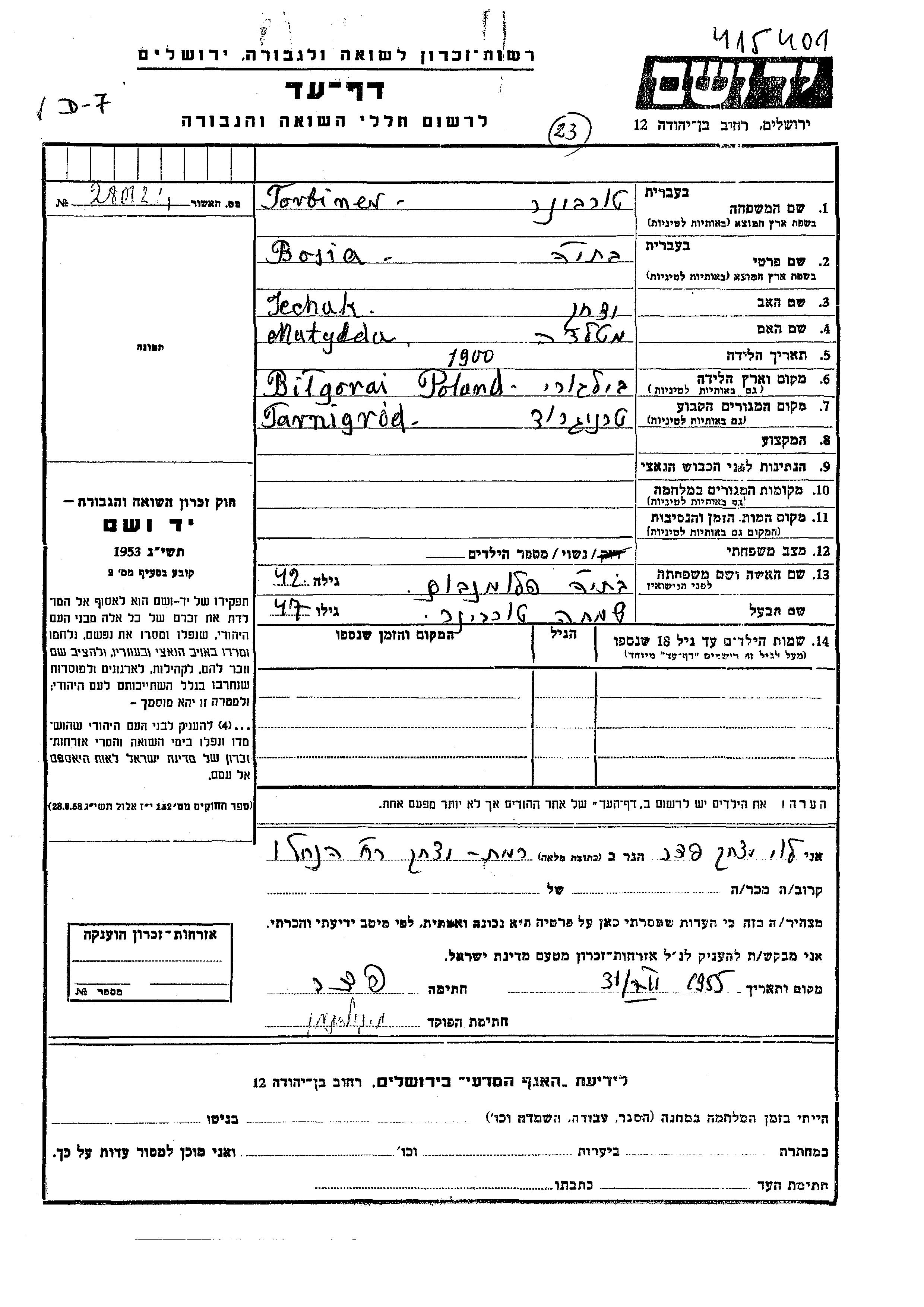 Torbiner Chaia Warszawa, Polen Gedenkblatt