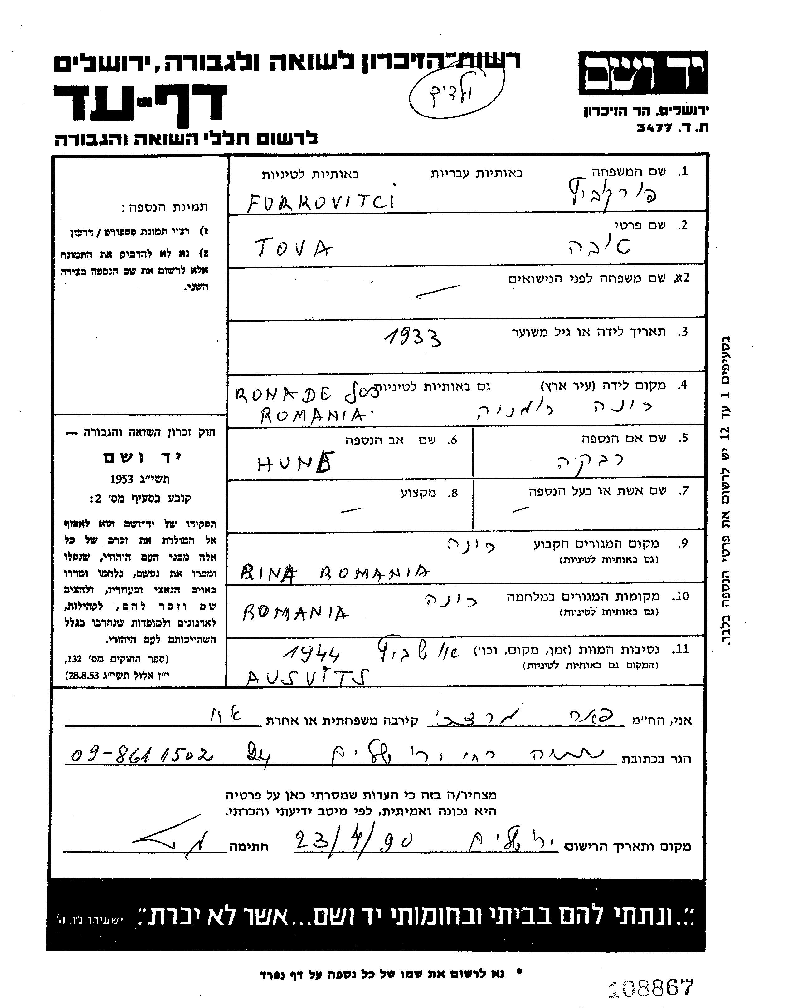 Tova Forkovici wurde im Jahr 1933 in Rina, Rumänien geboren. Vor dem Zweiten Weltkrieg lebte sie in Rina, Rumänien.