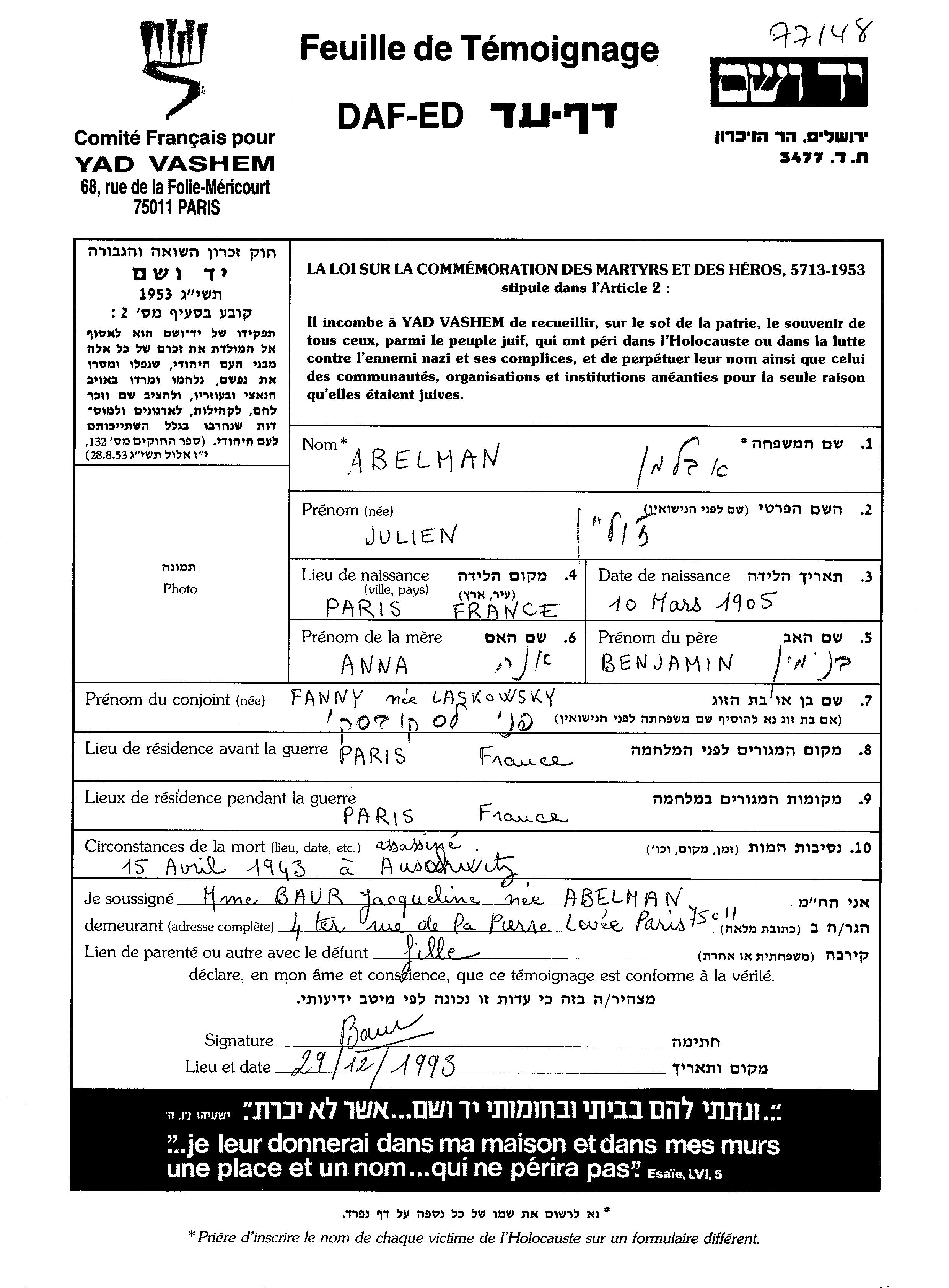 | Abelman | Julien | 1905 | Paris, Frankreich | Gedenkblatt |