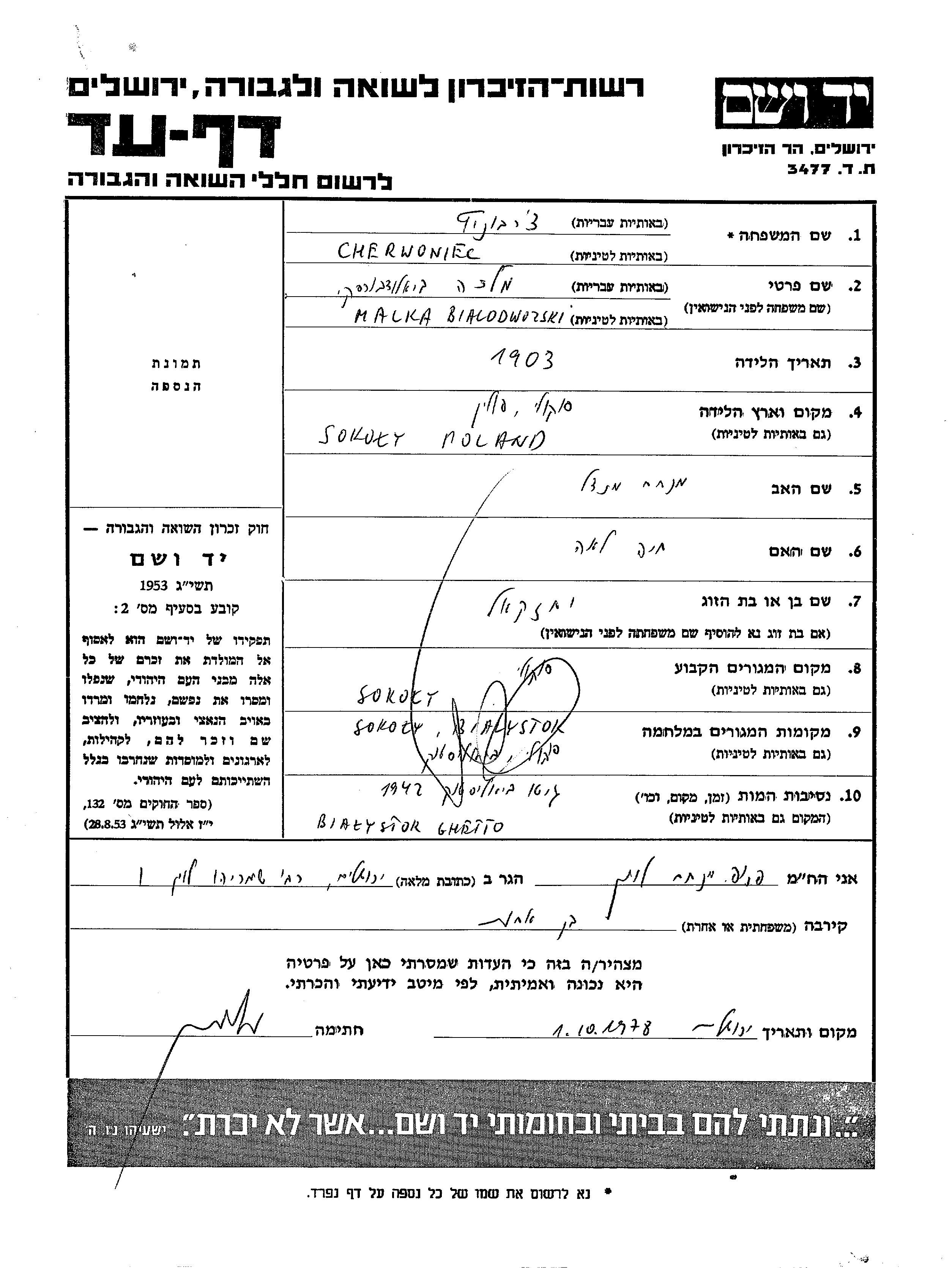 Malka Czerwoniec Chernovich, geb. Bialodworski wurde im Jahr 1903 geboren. Vor dem Zweiten Weltkrieg lebte sie in Sokoly, Polen.